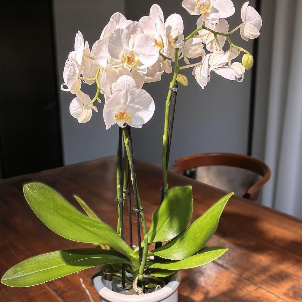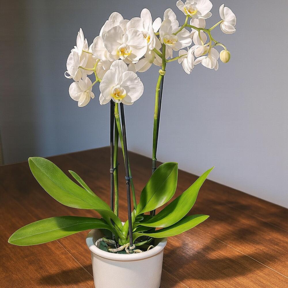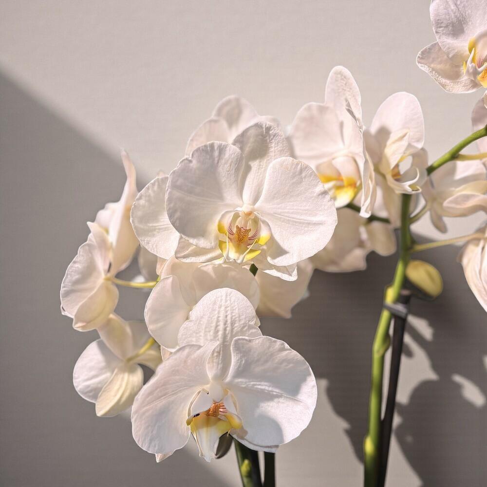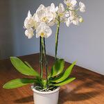 Elegant white Phalaenopsis orchid that radiates purity and serenity, ideal for brightening any space in the home or office. Its delicate snow-white flowers with a touch of yellow in the center add sophistication and natural freshness. Perfect as a special gift or as a long-lasting decorative accent.