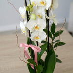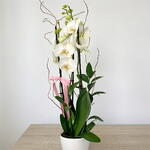 White phalenopsis orchid plant, accents of green ruscus leaves, pink ribbon, and white ceramic planters.