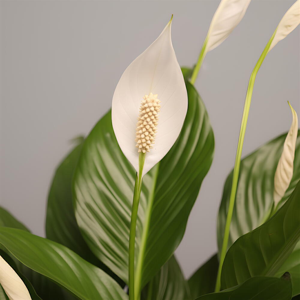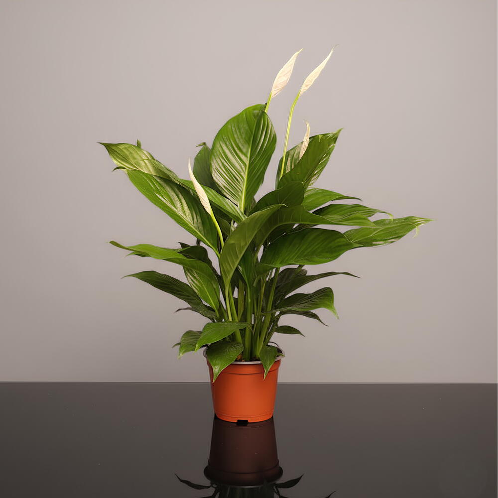 The Spathiphyllum, also known as the "Peace Lily", is an indoor plant highly valued for its natural elegance. Its glossy green leaves and white spathe-shaped flowers bring freshness and harmony to any space. It is an excellent choice for offices, living rooms, or bedrooms thanks to its ability to purify the air.