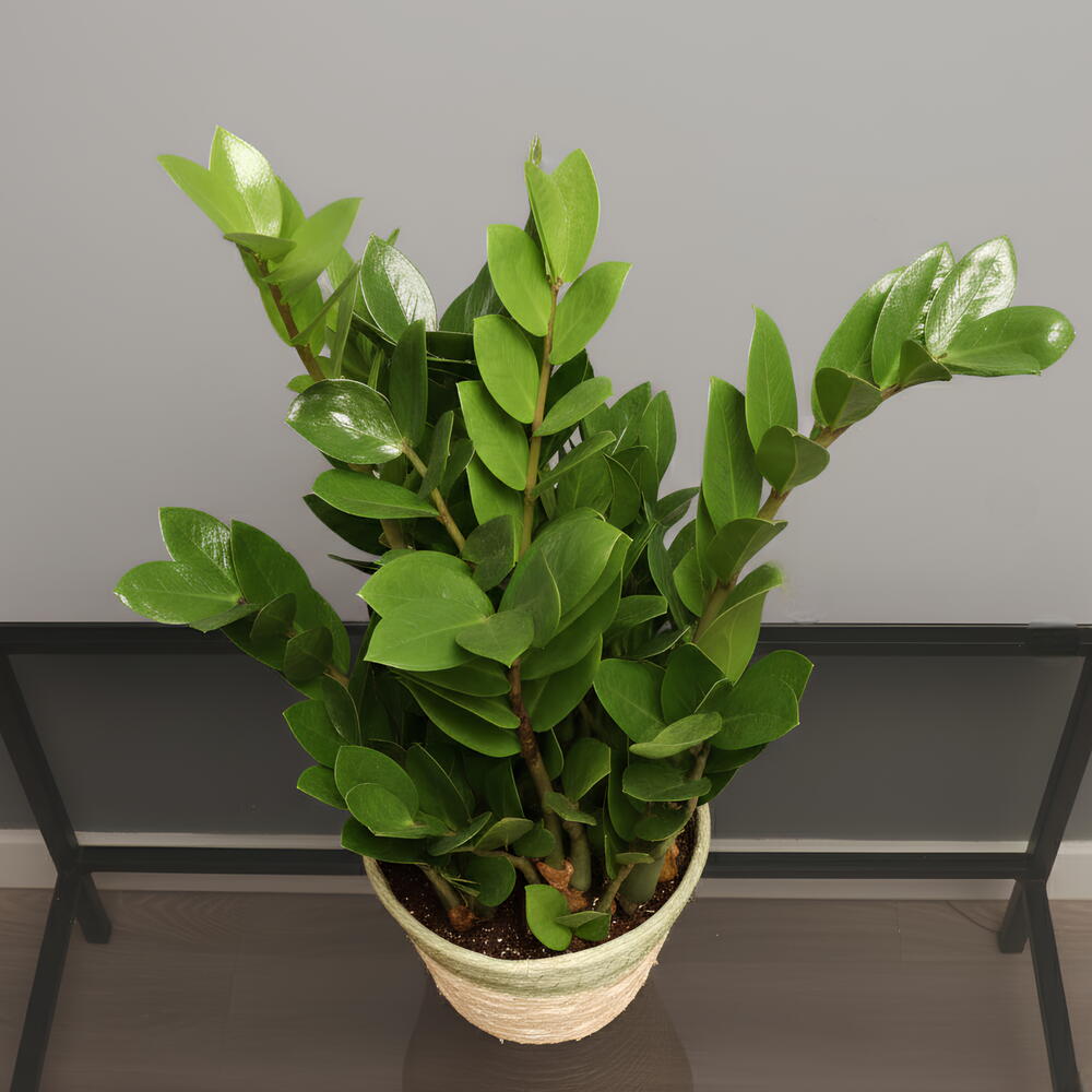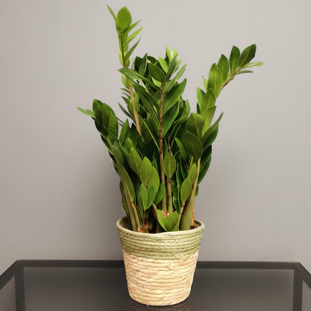 Zamioculca zamiifolia, known as the ZZ plant, is an elegant indoor plant with glossy upright green leaves. Ideal for modern and minimalist spaces, it is famous for its hardiness and structural beauty.
