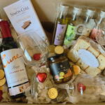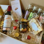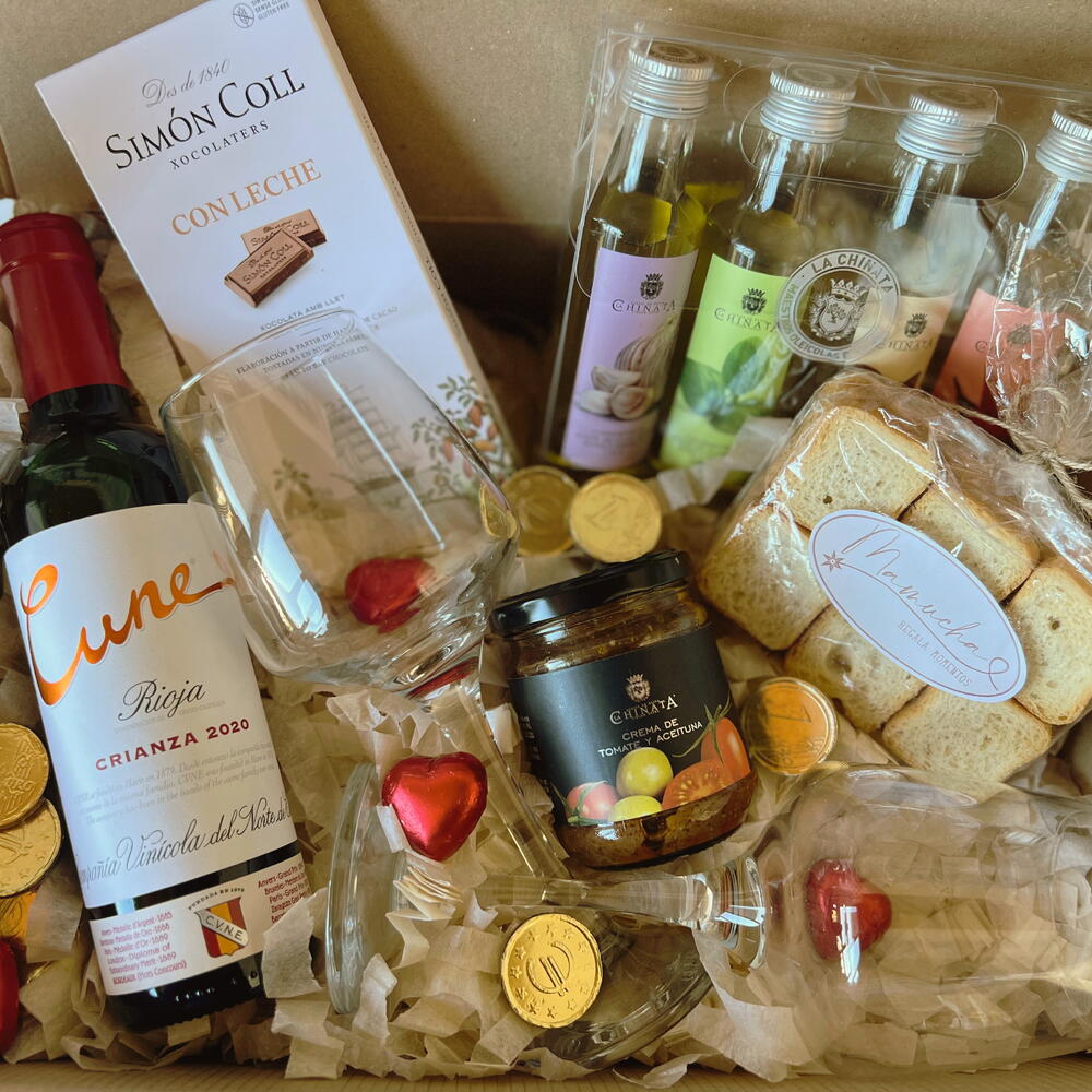 Simón Coll chocolate bar - 1 pcs flavored olive oils from La Chinata (100 cl each) - 4 pcs large package of mini toasts - 1 pcs heart-shaped chocolates - 4 pcs chocolate coins - 8 pcs wine glasses - 2 pcs La Chinata flavored cream 180 g - 1 pcs mini bottle of wine cuné 37.5cl - 1 pcs