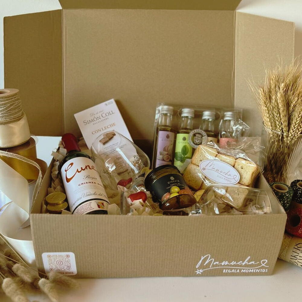 The Gourmet Premium Olive Oil Tasting Box is an exquisite selection designed for lovers of fine dining. This set combines the elegance of a Cune Crianza wine with an exclusive collection of flavored extra virgin olive oils from La Chinata, ideal for tasting and discovering unique gastronomic nuances. Accompanied by crunchy toasts, a smooth flavored cream from La Chinata, Simón Coll artisanal chocolate and delicious chocolate hearts, this gourmet gift is perfect for celebrations, anniversaries, romantic dinners or as a special detail for those who enjoy select products and complete culinary experiences.