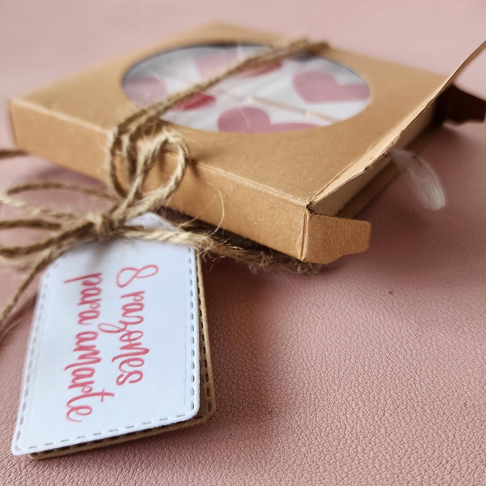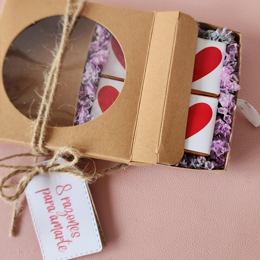 Because love is also expressed in small details ✨ This small box with a round window holds 8 mini chocolates, each with a heart-shaped tag where you can write a reason why you love that special person. Eight messages, eight moments, eight reasons that make your love unique. Perfect for gifting on Valentine's Day, to surprise, to move, and to create a memory that lasts forever. 💝 Ideal for couples, anniversaries, or simply to say I love you without the need for big words.