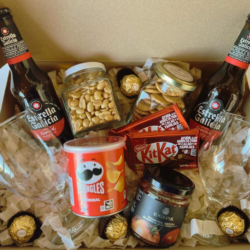 bombones ferrero rocher - 4 pcs kit kats - 2 pcs mini can of Pringles - 1 pcs mini bottles of Estrella Galicia beer 25 cl - 7 pcs personalized glasses - 2 pcs personalized jar filled with peanuts - 1 pcs personalized jar filled with savory crackers - 1 pcs 180 g jar of sun-dried tomatoes from la chinat - 1 pcs