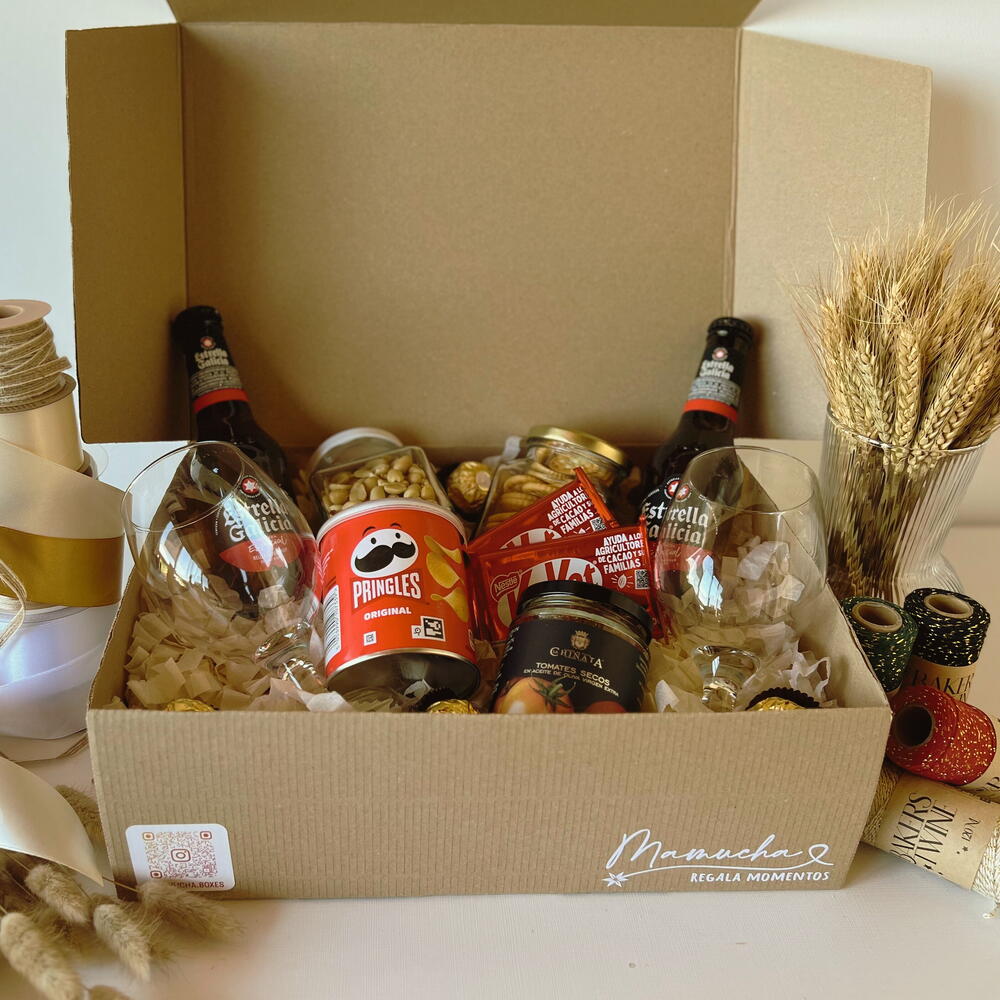 The CHILLAX 2 box is the perfect gift for those who enjoy a relaxed experience with intense flavors and selected products. Designed to surprise, it includes Estrella Galicia beers, savory snacks, premium chocolates and high-quality delicacies. Its careful presentation in a kraft box makes it an ideal choice for birthdays, thank-yous, celebrations or simply to gift a special moment. Each element has been chosen to create a delicious experience balanced between sweetness, saltiness and texture.