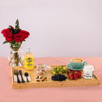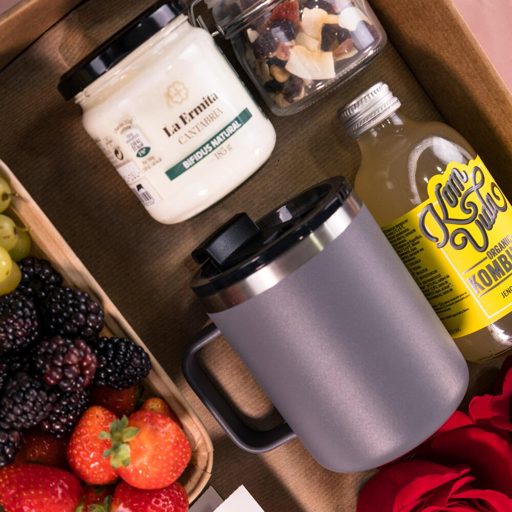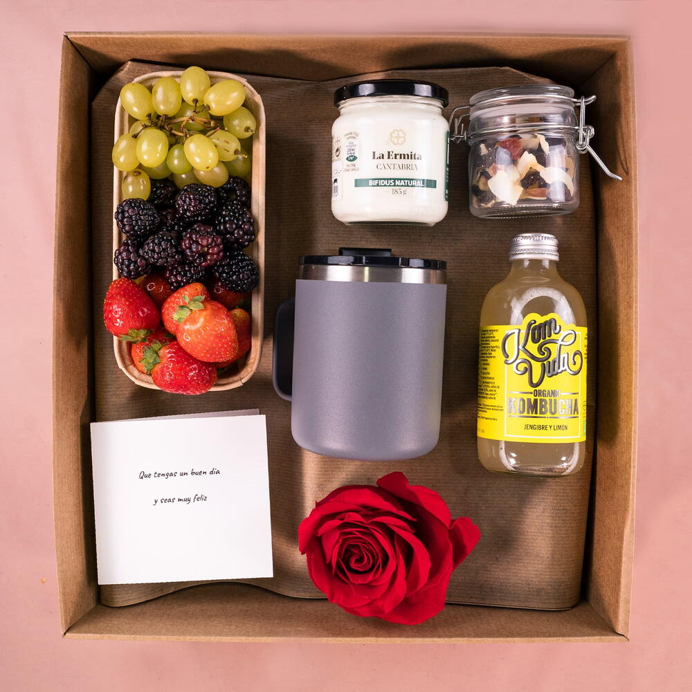 rosas rojas - 6 pcs fresas - 120 g blackberries - 80 g green grape - 150 g probiotic kefir - 185 g mix of dried fruits - 40 g thermal mug with coffee - 1 pcs presentation box - 1 pcs