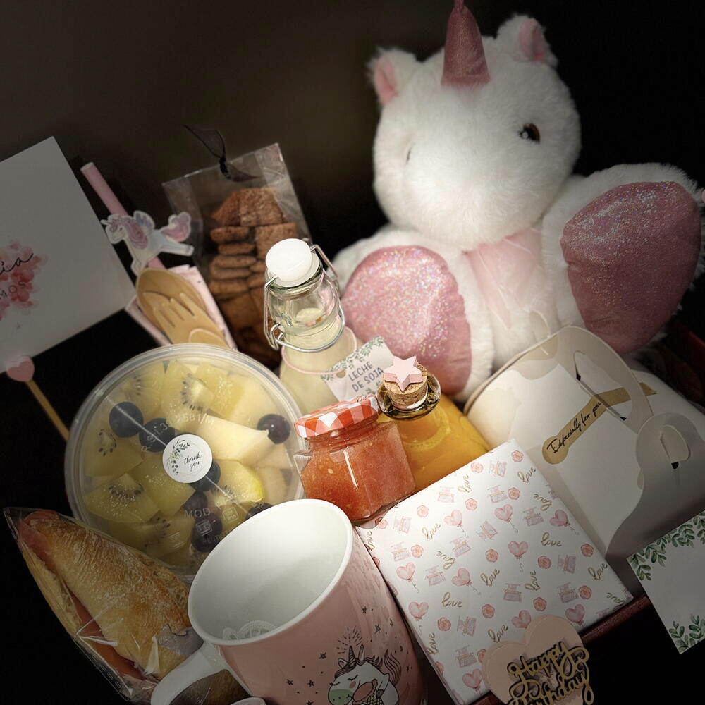 Enjoy an exquisite sweet full of flavor and fun. It includes a delicious croissant, an irresistible mini Nutella to give you a sweet treat, accompanied by fresh fruit on a tray to refresh your palate. To keep you hydrated, it includes a vitamin-rich orange juice and a nutritious yogurt. Also, a jar of honey to sweeten your days, homemade pastries to snack on whenever you want something tasty, and a beautiful unicorn-designed mug to brighten your mornings. Not forgetting an adorable unicorn plush to add a special touch to your space. A perfect combo for lovers of all things sweet and magical!
