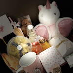 mini nutella - 50 g cookies - 50 g orange juice - 200 ml unicorn plush toy - 1 pcs ham sandwich - 1 pcs fresh fruit on a tray - 100 g dairy dessert - 50 g crushed tomato - 100 g mug with unicorn design - 1 pcs