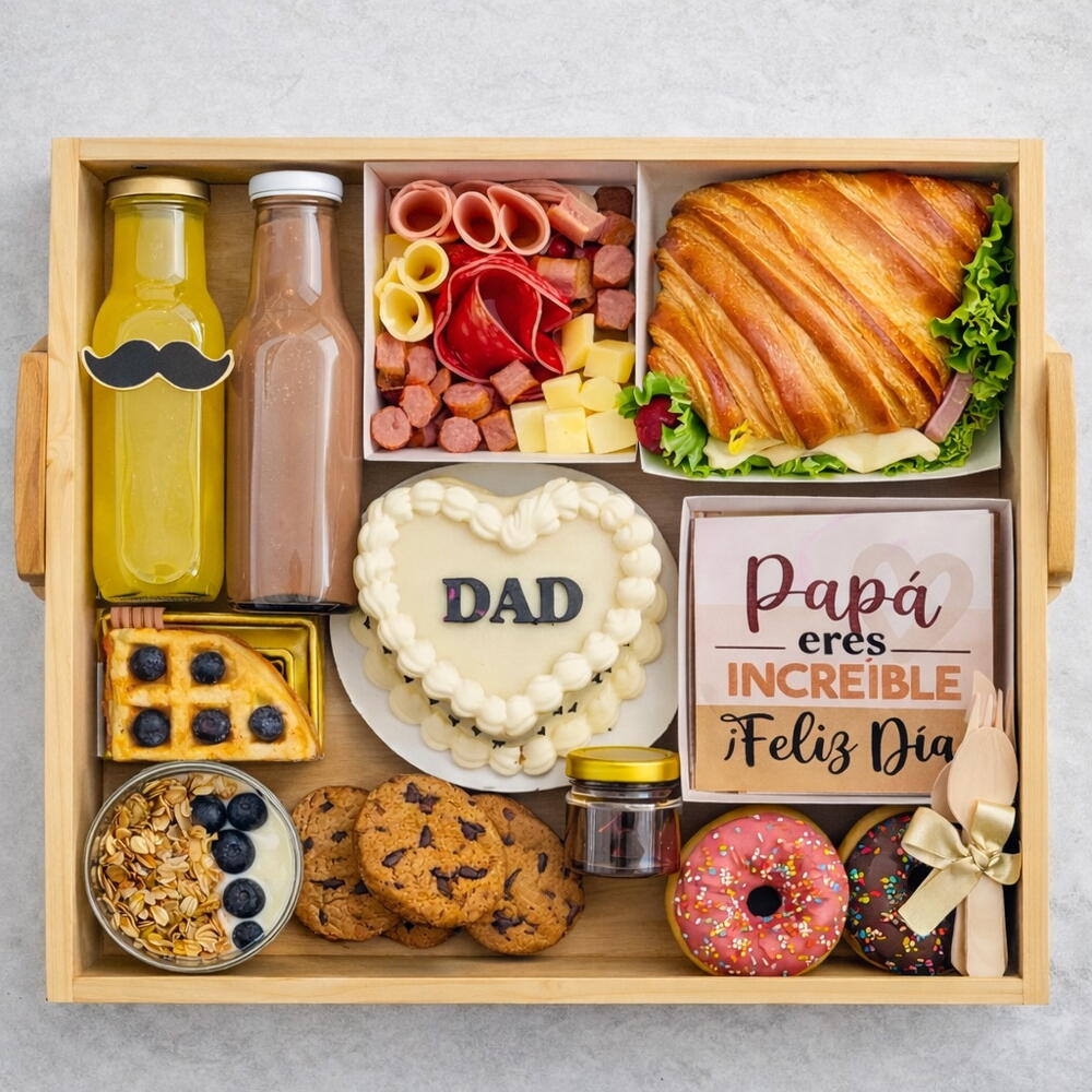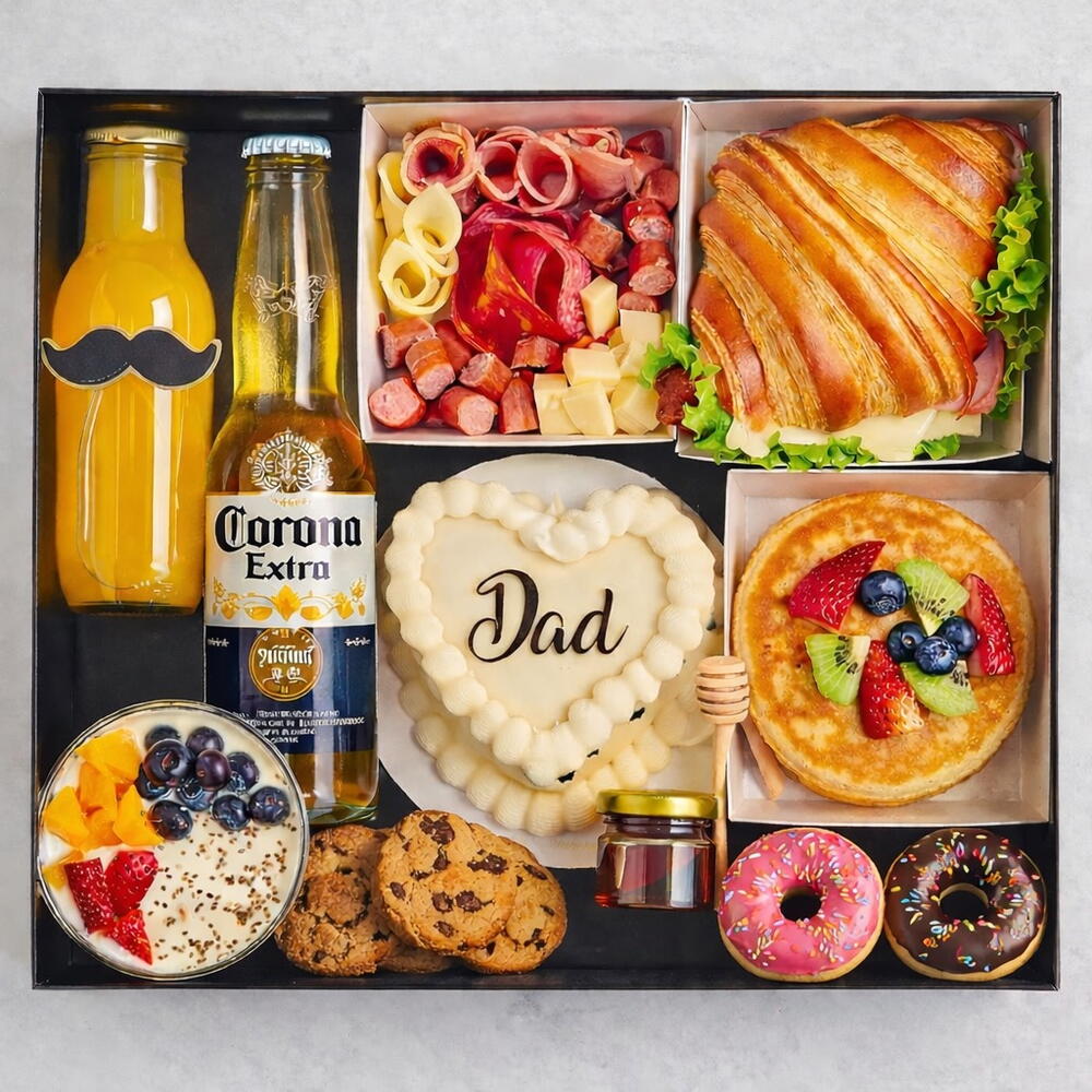 cookies - 3 pcs wooden tray - 1 pcs orange juice - 1 pcs pancakes with mixed berries - 4 pcs donuts - 2 pcs Iberian meats and cheeses - 100 g Corona Extra beer - 1 pcs savory croissant - 1 pcs mini cake for dad - 1 pcs inn - 1 pcs