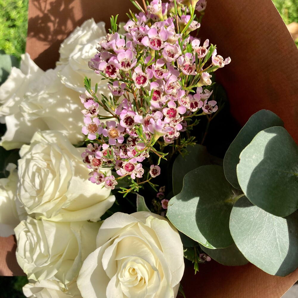 Eucalyptus - 3 ud. rosas blancas - 11 ud. flor de cera o paniculata - 2 ud.