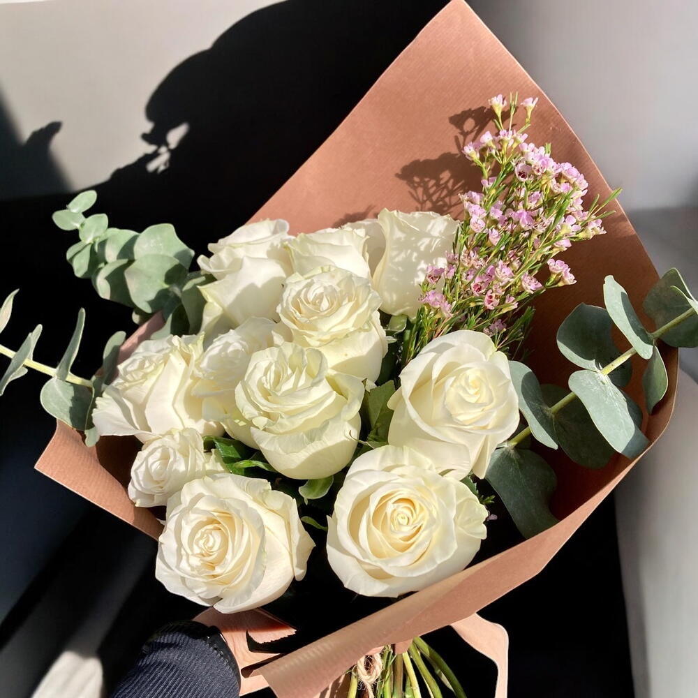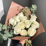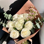 Este elegante ramo de rosas blancas es la elección perfecta para expresar pureza, paz y afecto. Cada rosa está rodeada de suaves tonos verdes de eucalipto y delicadas flores de limonium, creando una composición armoniosa y sofisticada. Ideal para ocasiones especiales o simplemente para añadir un toque de serenidad a cualquier ambiente, este arreglo es un verdadero clásico que nunca pasa de moda.