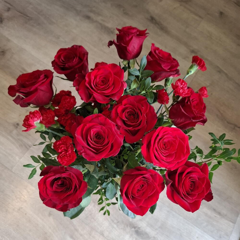 Greenery - 4 ud. carnation - 4 ud. rosa rojas - 12 ud.