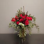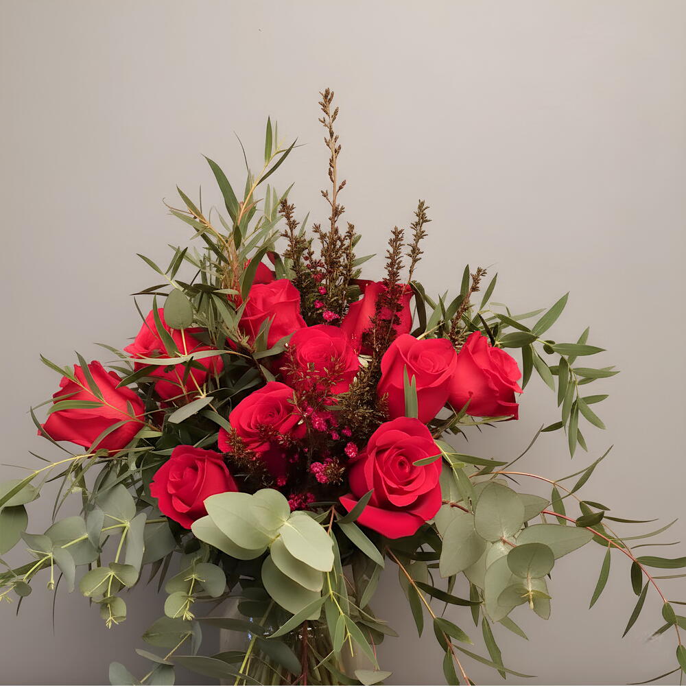 eucalipto - 10 ud. rosas rojas - 12 ud. leucadendron (ramas rojizas oscuras) - 3 ud. lentisco ruscus (verde) - 6 ud.