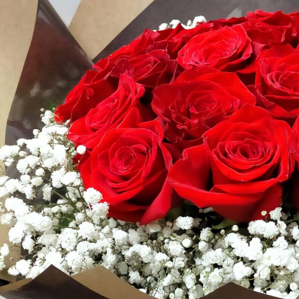 Un fascinante ramo clásico compuesto por 20 encantadoras rosas rojas, realzadas con 5 hermosas paniculatas blancas. Este ramo está delicadamente envuelto en 2 elegantes envoltorios decorativos. Perfecto para expresar amor, pasión y romance.