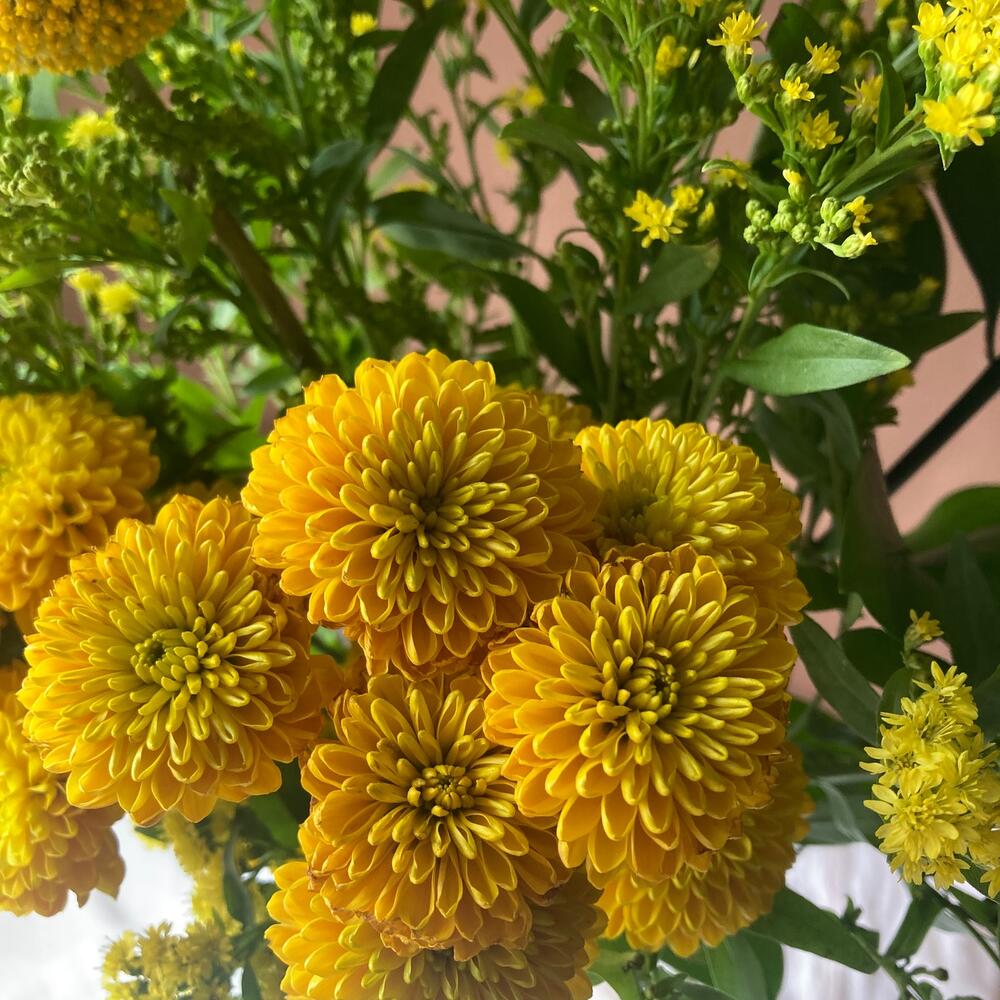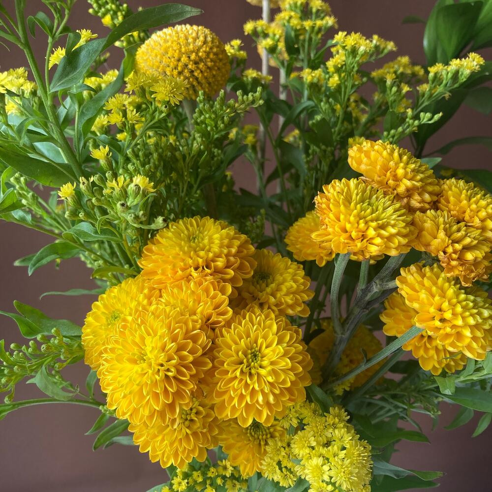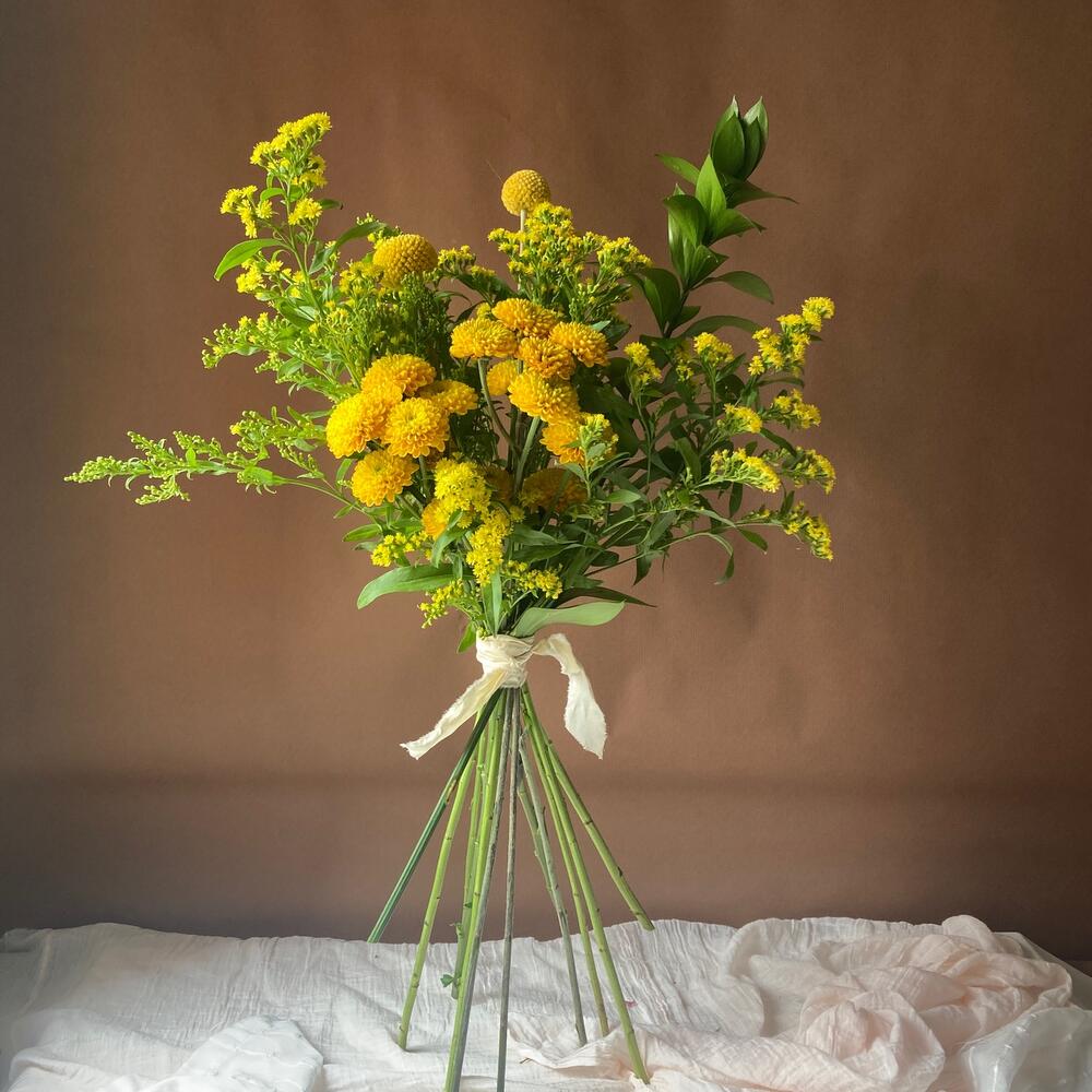 Ruscus - 1 ud. Solidago - 3 ud. margaritas - 5 ud. craspedias - 3 ud.