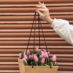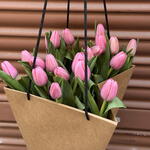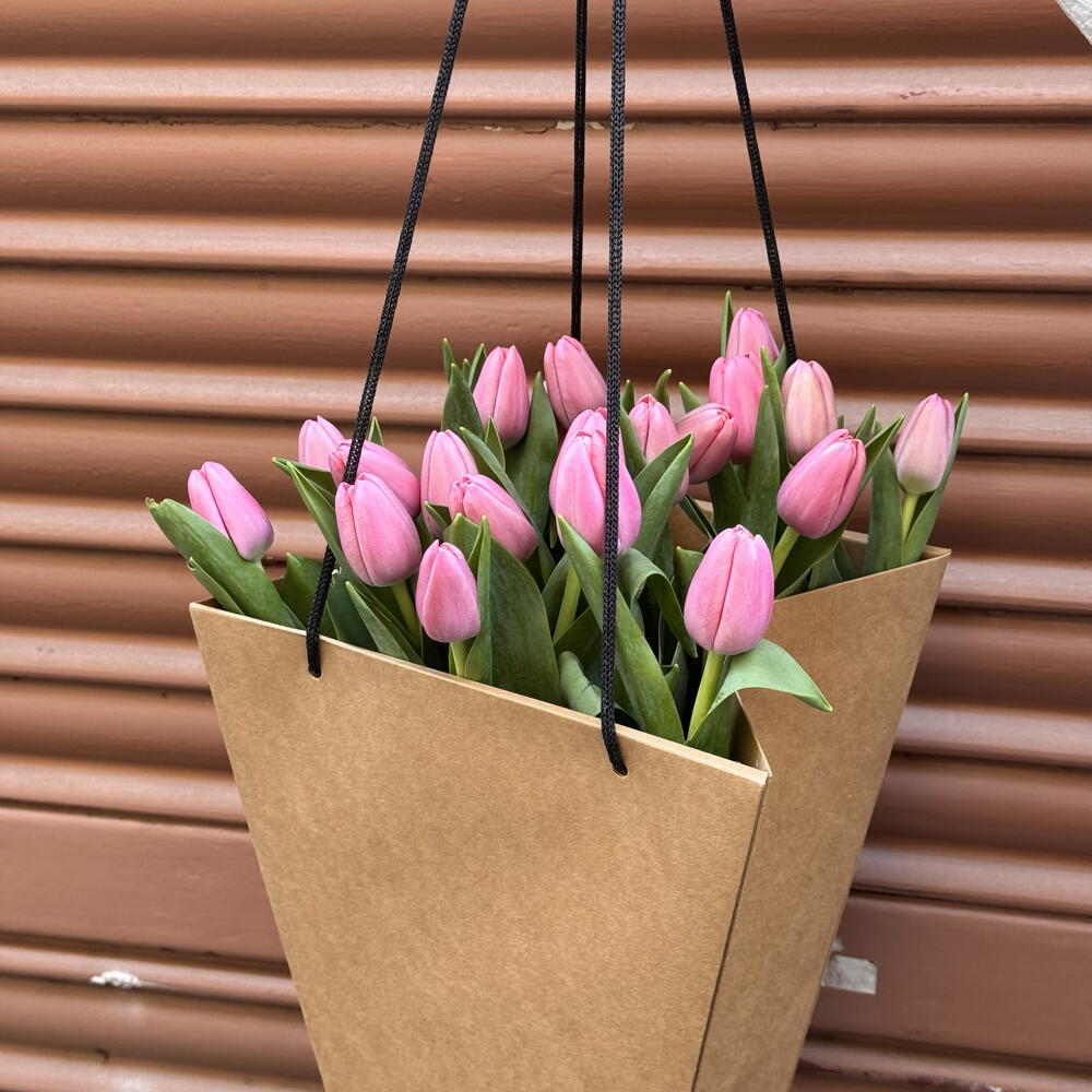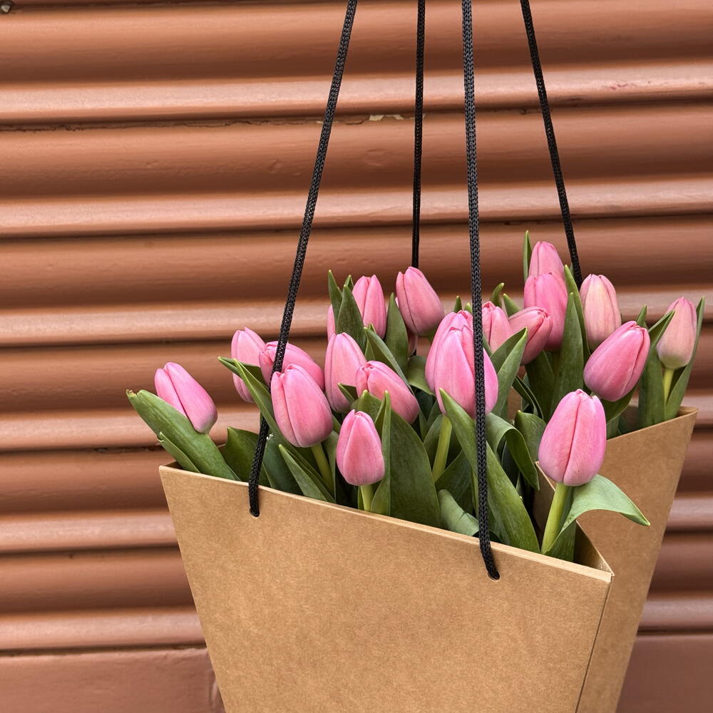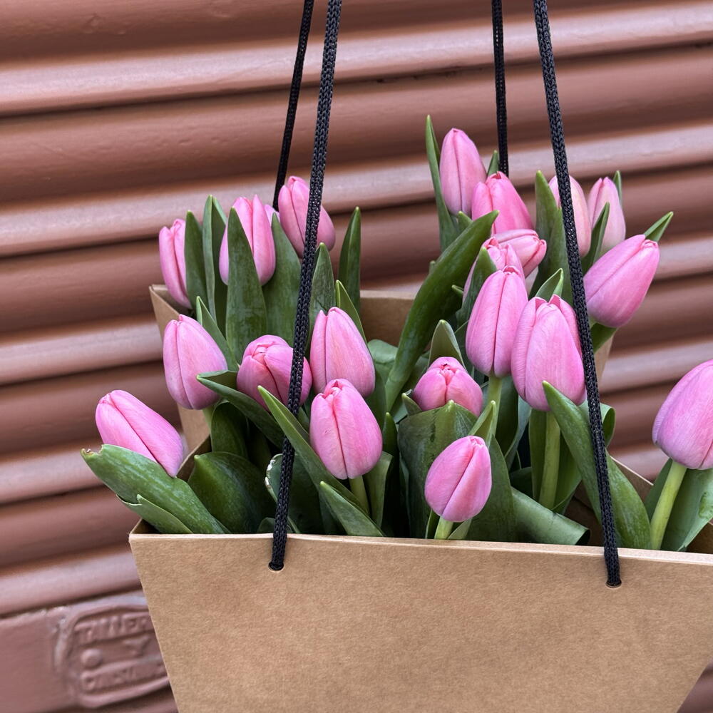Elegante ramo de tulipanes rosados presentado en una bolsa minimalista, ideal para sorprender con delicadeza y estilo. Las flores frescas transmiten ternura y armonía, perfectas para cualquier ocasión especial. Un detalle moderno y sofisticado que ilumina el día de quien lo recibe.