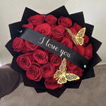 rosas rojas - 25 ud. cinta personalizada - 1 ud. mariposas decorativas doradas - 2 ud.