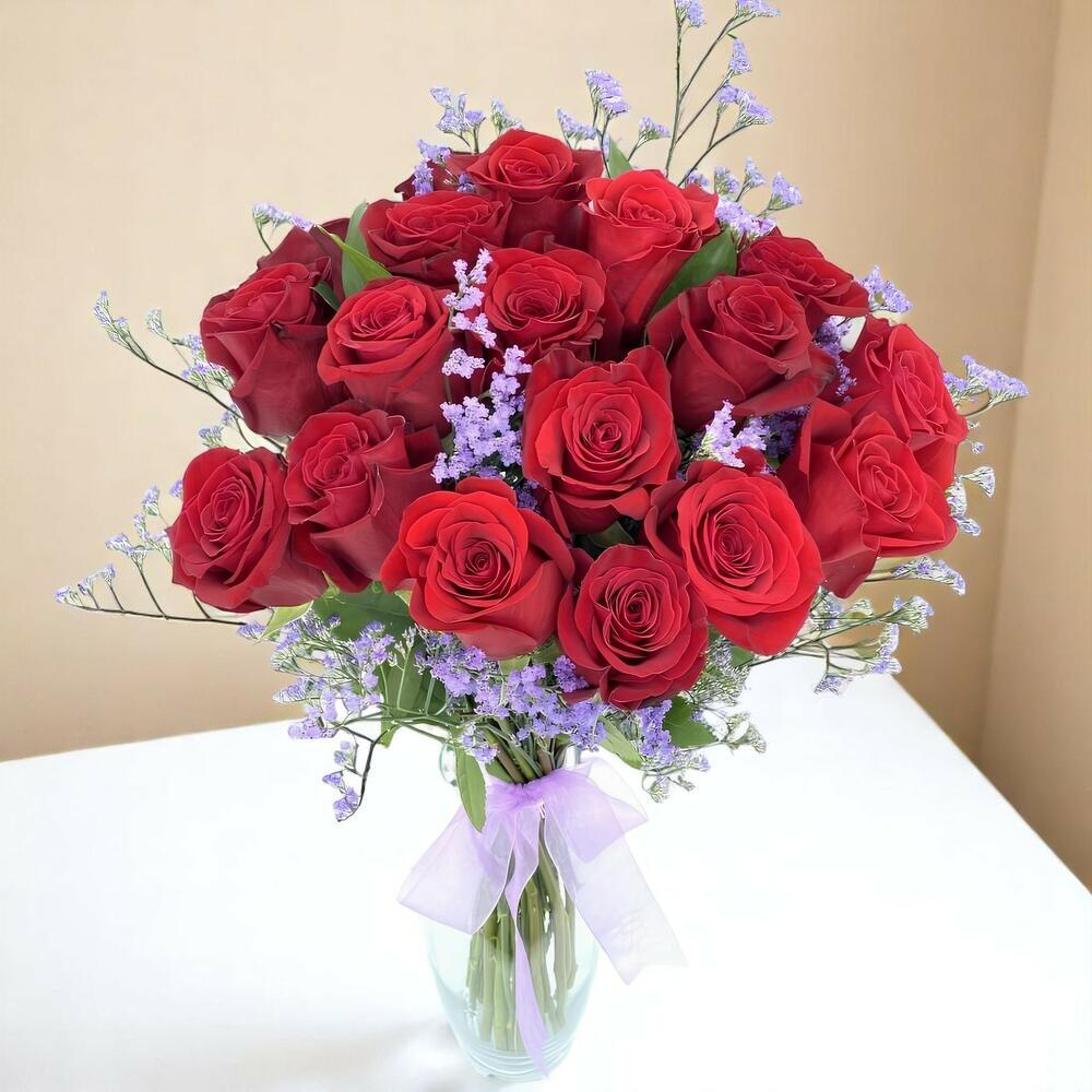 Este espectacular ramo de rosas rojas combina pasión y romanticismo con un toque delicado de flores lilas. Decorado con un lazo púrpura, este arreglo floral es perfecto para ocasiones especiales como aniversarios, cumpleaños o simplemente para sorprender a alguien especial. Su elegancia y vibrante colorido lo convierten en un regalo inolvidable que expresa amor y admiración.