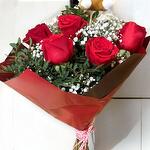 Este es un hermoso conjunto de autor único que consta de cinco rosas rojas exquisitas, junto a paniculata blanca fresca y ramas de lentisco verde para un toque de sofisticación. También se incluye un encantador osito de peluche suave y un corazón de madera, lo que lo hace el regalo perfecto. El conjunto se completa con un papel floral y un lazo de corazón, haciendo de este producto el regalo perfecto para celebrar el amor.