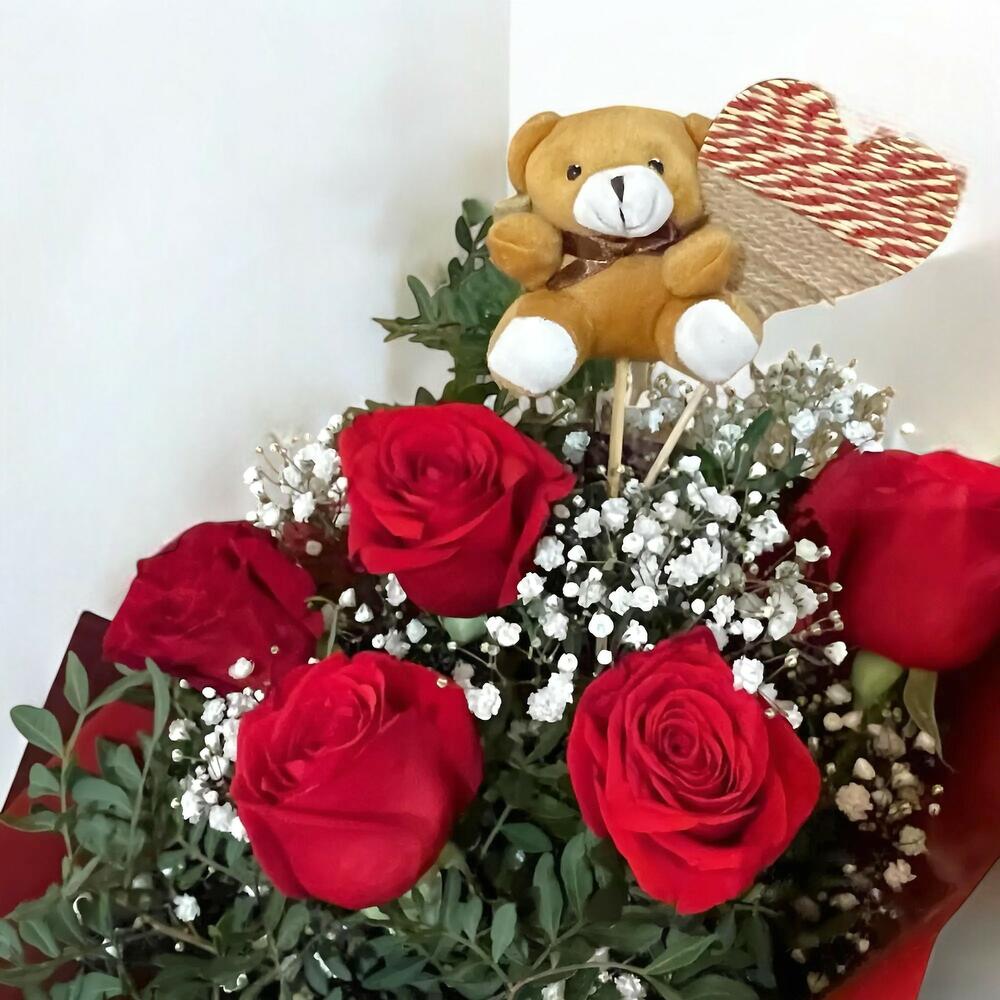 Este es un hermoso conjunto de autor único que consta de cinco rosas rojas exquisitas, junto a paniculata blanca fresca y ramas de lentisco verde para un toque de sofisticación. También se incluye un encantador osito de peluche suave y un corazón de madera, lo que lo hace el regalo perfecto. El conjunto se completa con un papel floral y un lazo de corazón, haciendo de este producto el regalo perfecto para celebrar el amor.