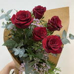 envoltorio - 1 ud. papel kraft - 1 ud. lazada - 1 ud. rosa roja premium - 5 ud. follajes verdes - 5 ud.