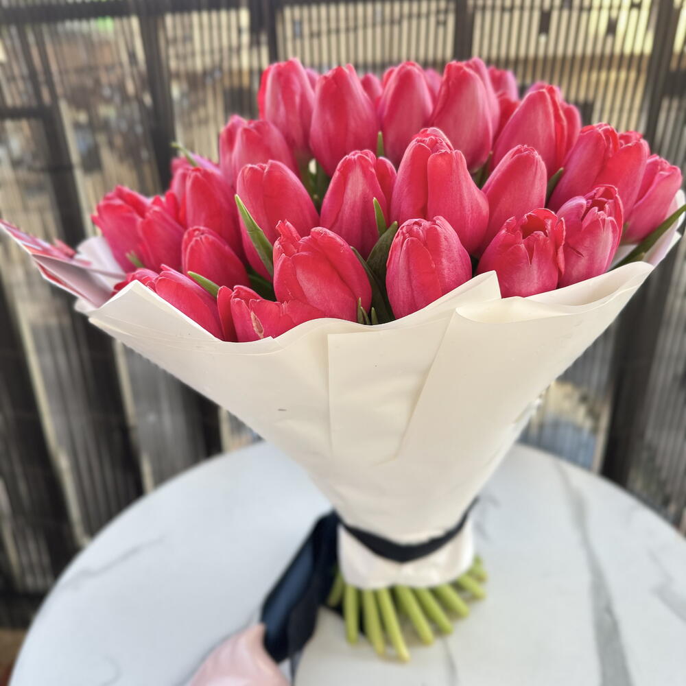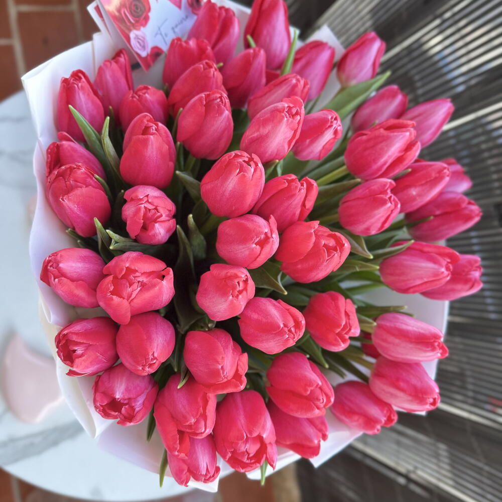 “Ramo de 50 tulipanes frescos, perfecto para sorprender en cumpleaños, aniversarios o simplemente alegrar el día.”