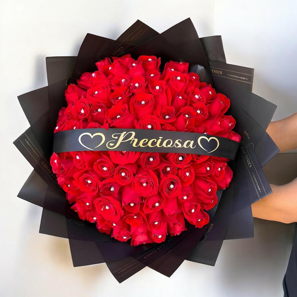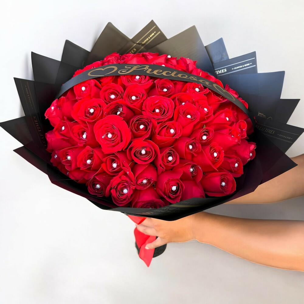 Este maravilloso ramo clásico es una suntuosa mezcla de 55 rosas rojas. La elegancia de estas flores se realza con una delicada cinta decorativa y están cuidadosamente envueltas en un sofisticado papel coreano. Elaborado con pasión y atención al detalle, este ramo es perfecto para cualquier ocasián que requiera un toque de distinción.