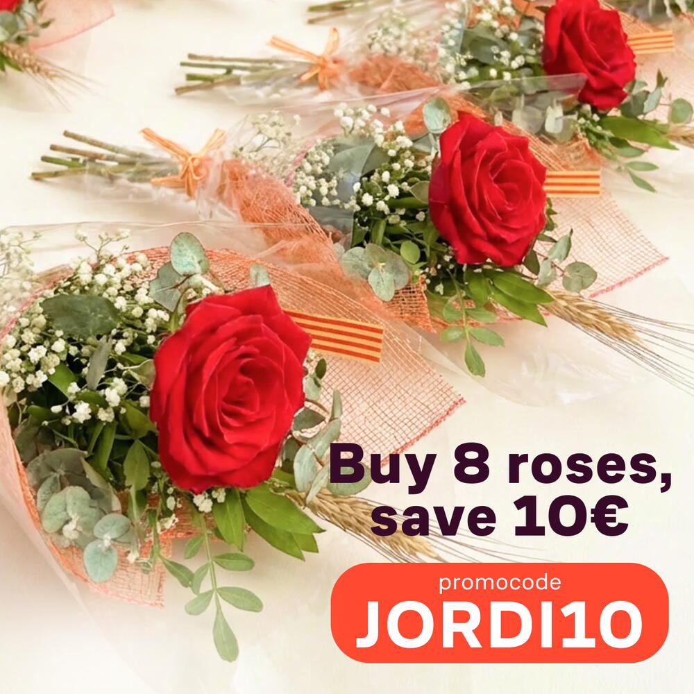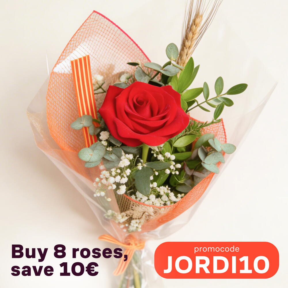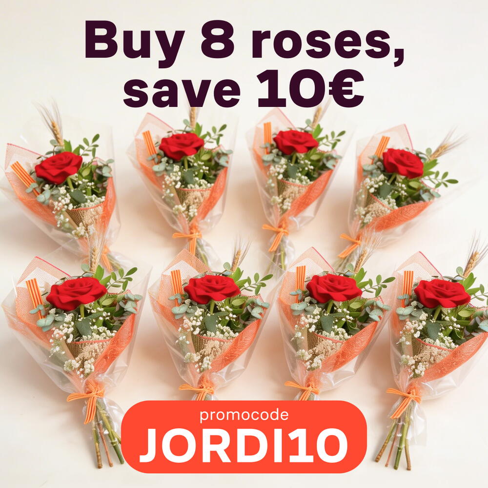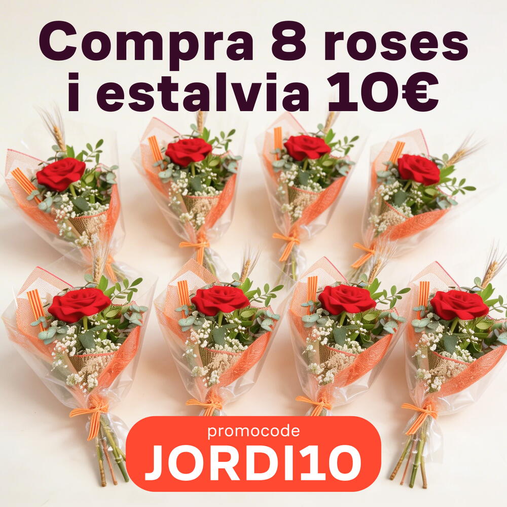 Celebra Sant Jordi con un formato pensado para regalar más de una sonrisa. Este pack incluye varias rosas frescas, cada una presentada en su propia envoltura elegante, listas para ser entregadas por separado. Es la opción perfecta para quienes quieren felicitar a varias personas en un mismo día: una rosa para mamá, otra para una amiga, otra para una compañera… Un solo pedido — múltiples detalles llenos de significado. Las rosas se preparan cuidadosamente con verdes decorativos y un packaging ligero y delicado, manteniendo la estética tradicional de Sant Jordi con un toque moderno. Un producto práctico para regalar, compartir y emocionar. Recomendaciones de cuidado: Coloca cada rosa en agua limpia lo antes posible. Cambia el agua cada 1–2 días y corta ligeramente el tallo en diagonal para prolongar su frescura.