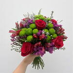 Un ramo vibrante y lleno de energía que combina la pasión de las rosas rojas, el encanto de las alstroemerias y el frescor de los crisantemos verdes. Los toques de statice y gypsophila aportan textura y delicadeza. Perfecto para celebrar momentos especiales, expresar gratitud o simplemente regalar alegría.