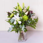 lilium blanco - 5 ud. verdes de temporada - 6 ud. anastasias - 3 ud. leucadendro - 3 ud.