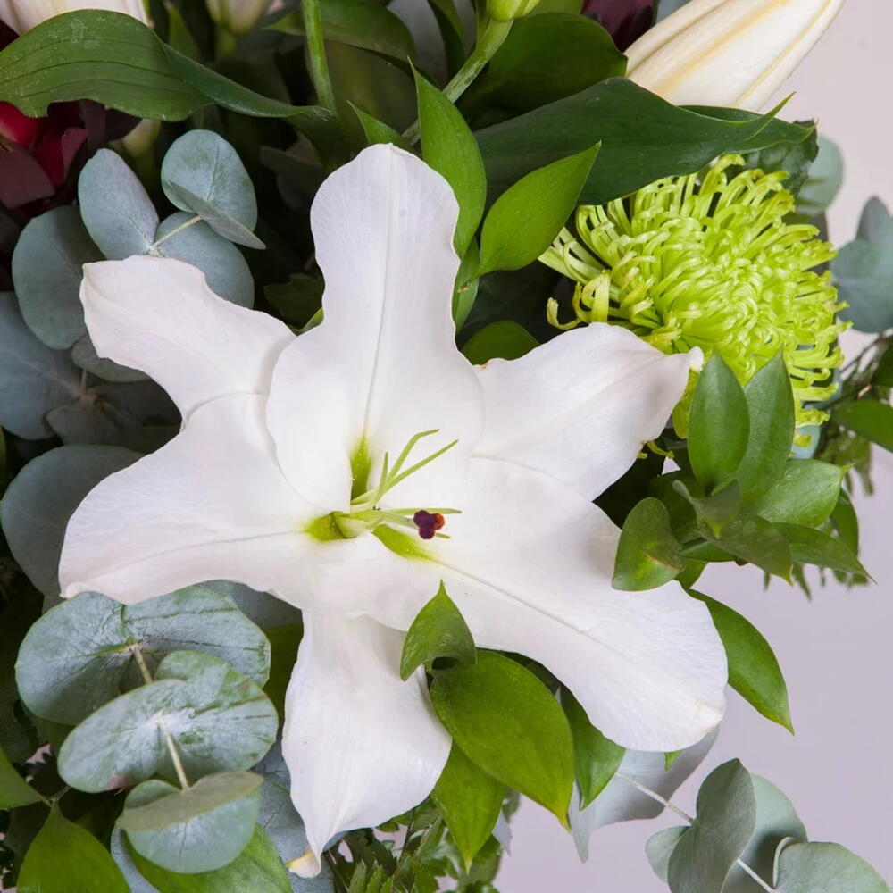 lilium blanco - 5 ud. verdes de temporada - 6 ud. anastasias - 3 ud. leucadendro - 3 ud.
