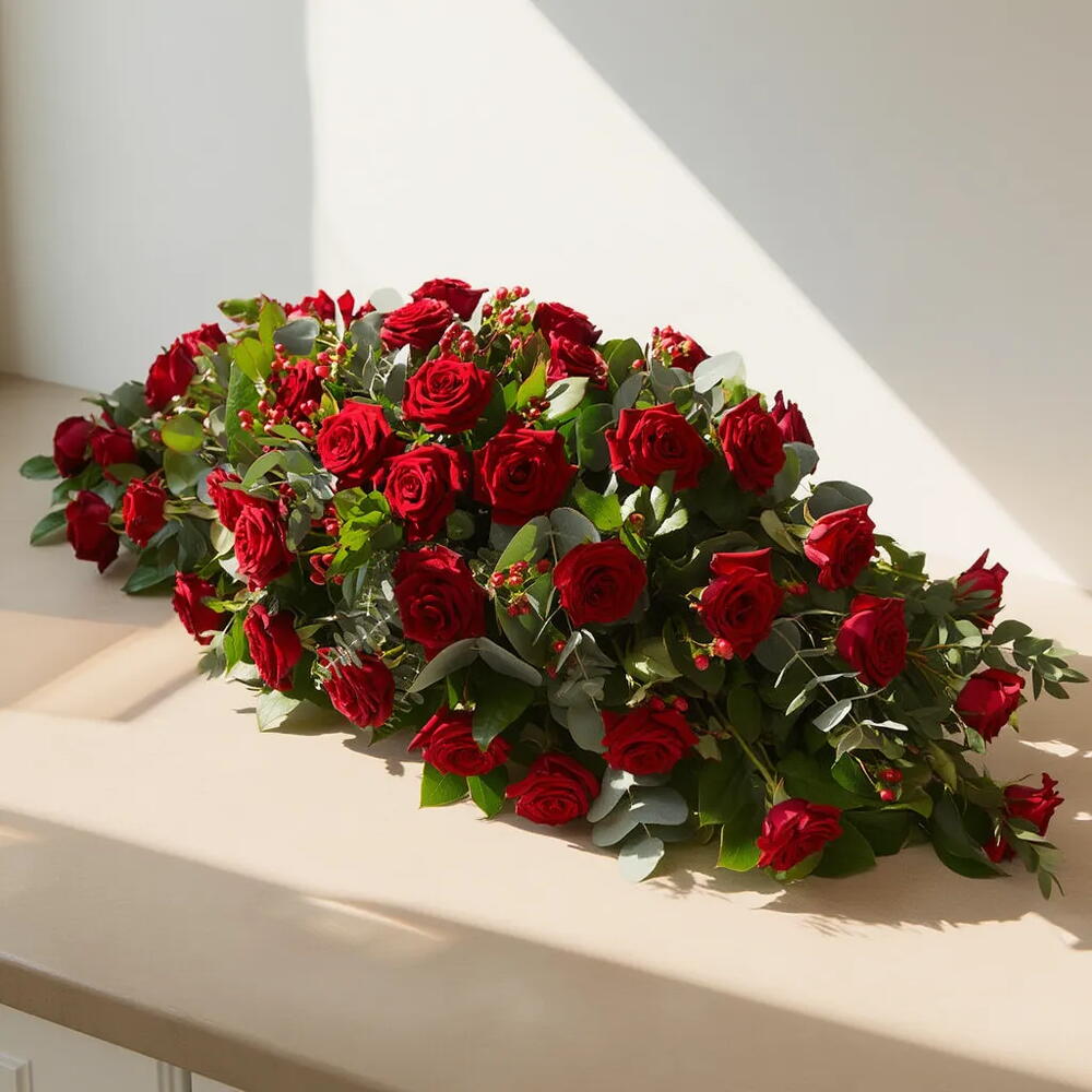 Almohadón funerario elaborado con rosas rojas y hypericum, una composición floral de condolencias que transmite amor eterno, respeto y homenaje. Este arreglo destaca por su forma horizontal y elegante, ideal para ceremonias de despedida. Las rosas rojas simbolizan sentimientos profundos, mientras los verdes variados aportan equilibrio y naturalidad. Es una decoración floral solemne y significativa, perfecta para honrar a un ser querido con un gesto lleno de sensibilidad y elegancia.