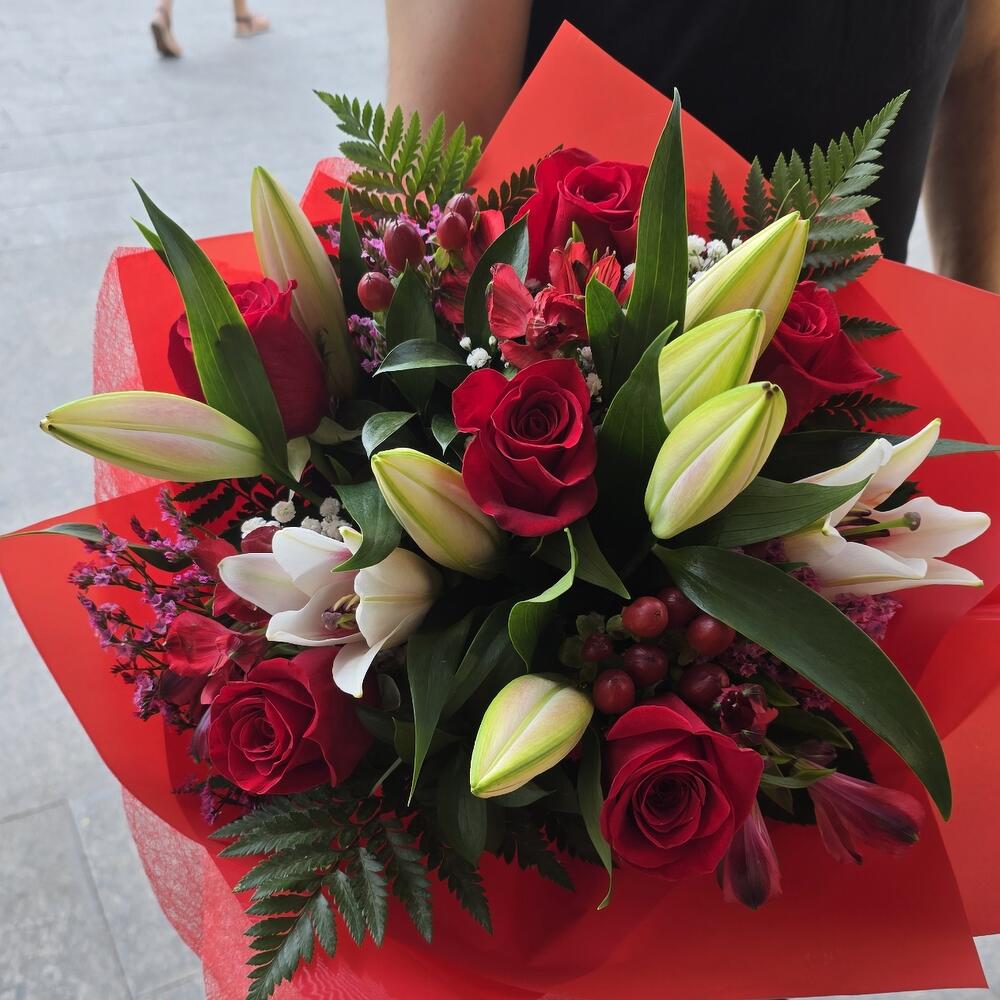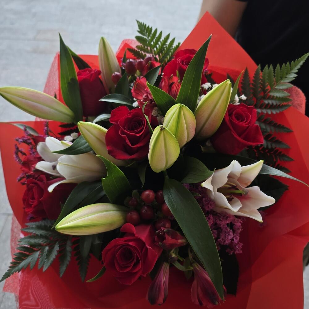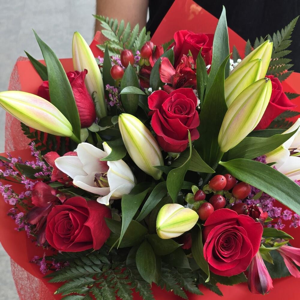 Este encantador arreglo floral está compuesto por 6 hermosas rosas rojas, rodeadas por 5 hojas verdes variadas, atadas con un lazo de cinta. También incluye 2 hojas de elegante papel coreano rojo para añadir un toque de sofisticación. El conjunto floral también cuenta con 3 paniculas blancas, 3 flores orientales rosas, 2 flores de ibericum rojo y 3 asltromerias rojas. Además, 4 flores de limoniun chino rosa proporcionan un resplandor suave al conjunto. La presentación se completa con 2 hojas de papel de tela rojoci, que añaden un toque de elegancia a este magnífico ramo. Este es un bouquet que captura la imaginación y el corazón, perfecto para expresar amor y aprecio. Es idóneo para regalar en cualquier ocasión especial.