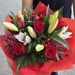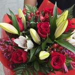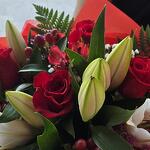 verdes variados - 5 ud. rosa rojas - 6 ud. lazo de cinta - 1 ud. papel coreano rojo - 2 ud. panicula blanca - 3 ud. oriental rosa - 3 ud. ibericum rojo - 2 ud. asltromeria roja - 3 ud. limoniun chino rosa - 4 ud. papel tela rojoci - 2 ud.