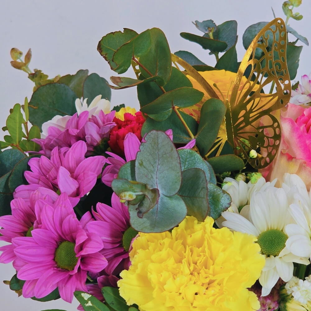 eucalipto - 4 ud. margaritas - 4 ud. paniculata - 2 ud. claveles - 5 ud. caja decorativa - 1 ud. Mariposa decorative - 1 ud. roses - 3 ud.