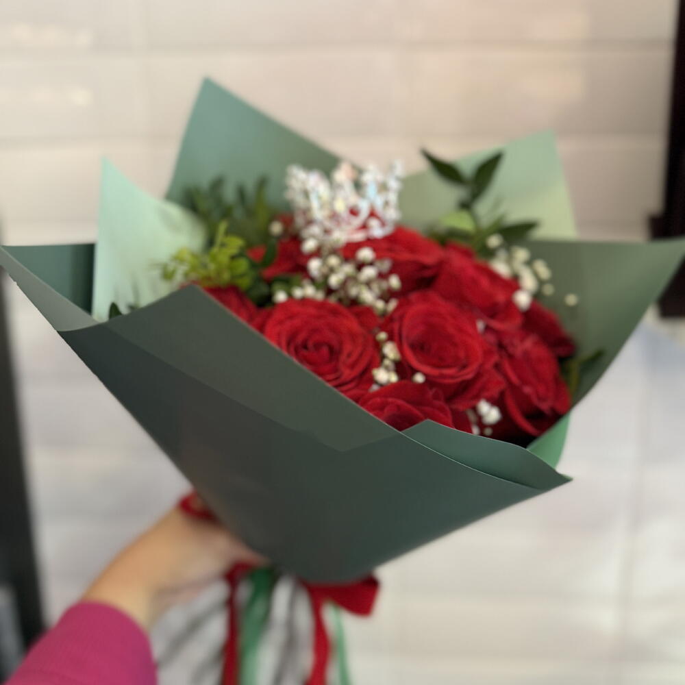 paniculata - 6 ud. verdes - 4 ud. rosas rojas - 14 ud. papel coreano - 2 ud. corona decorativa - 1 ud. cintas decorativas - 1 ud.