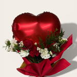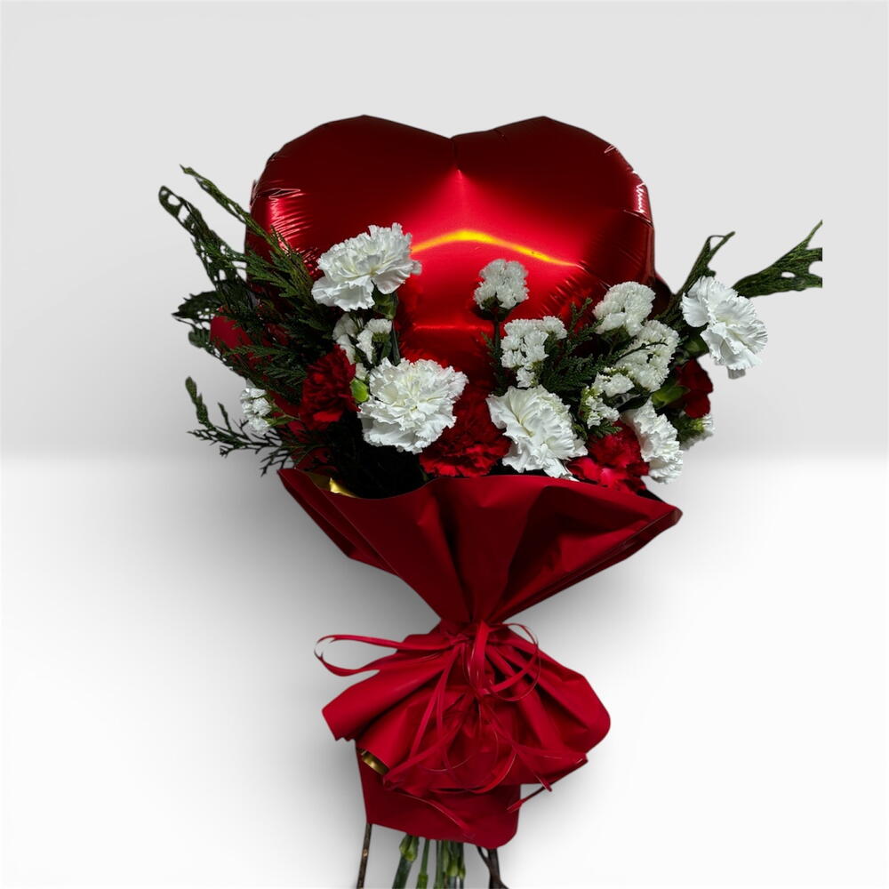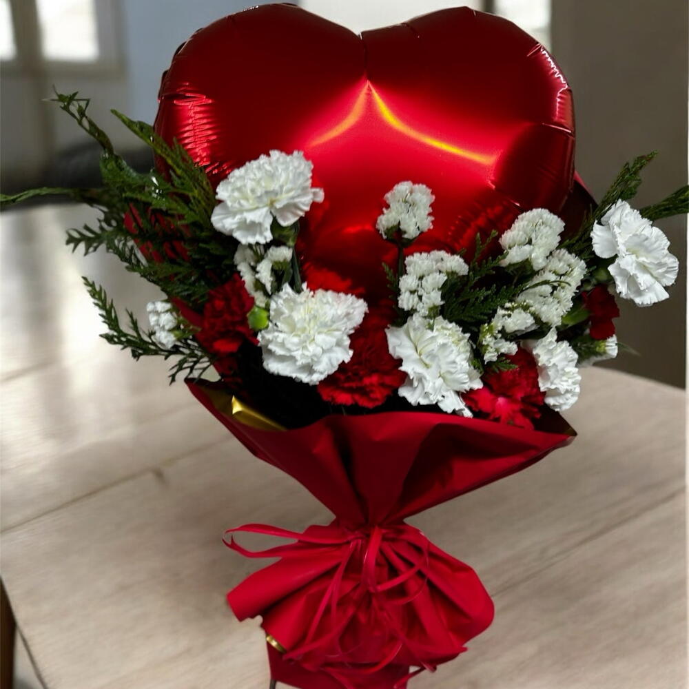 Rafia - 1 ud. clavel rojo - 4 ud. clavel blanco - 4 ud. tuya - 5 ud. papel coreano - 2 ud. siempreviva - 3 ud. globo corazón - 1 ud.