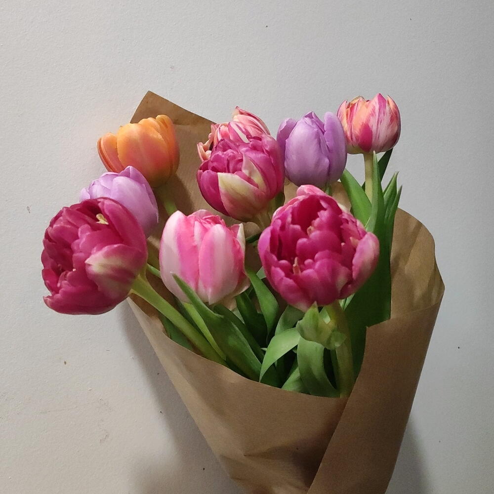 Alegre ramo de tulipanes dobles y multicolor ¡Una explosión de los colores de la primavera!