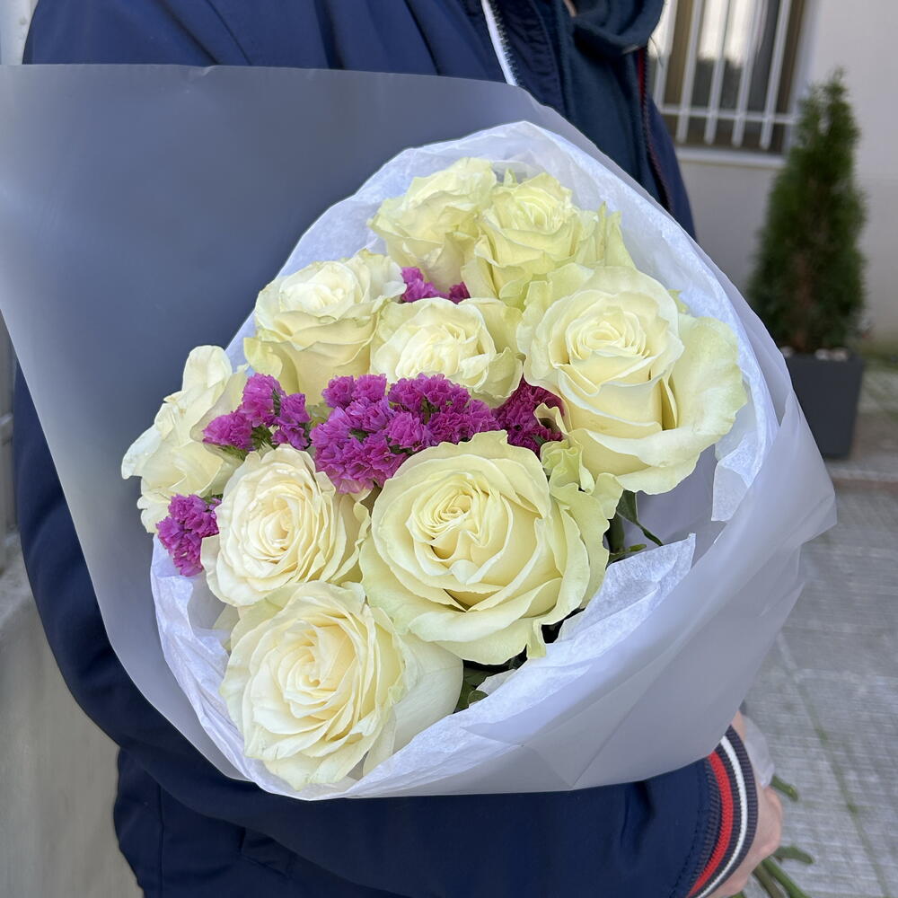 Un delicado ramo de 9 rosas blancas y statice hablará de sus sentimientos