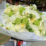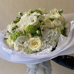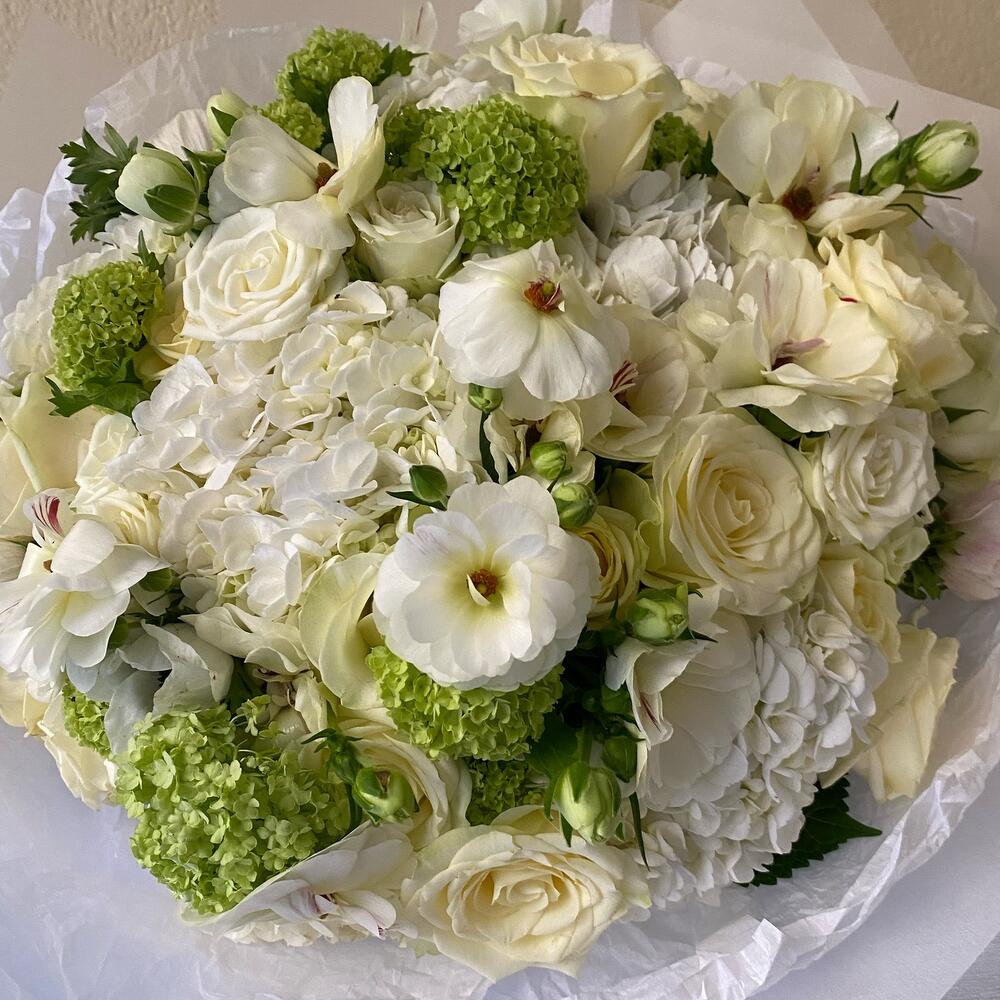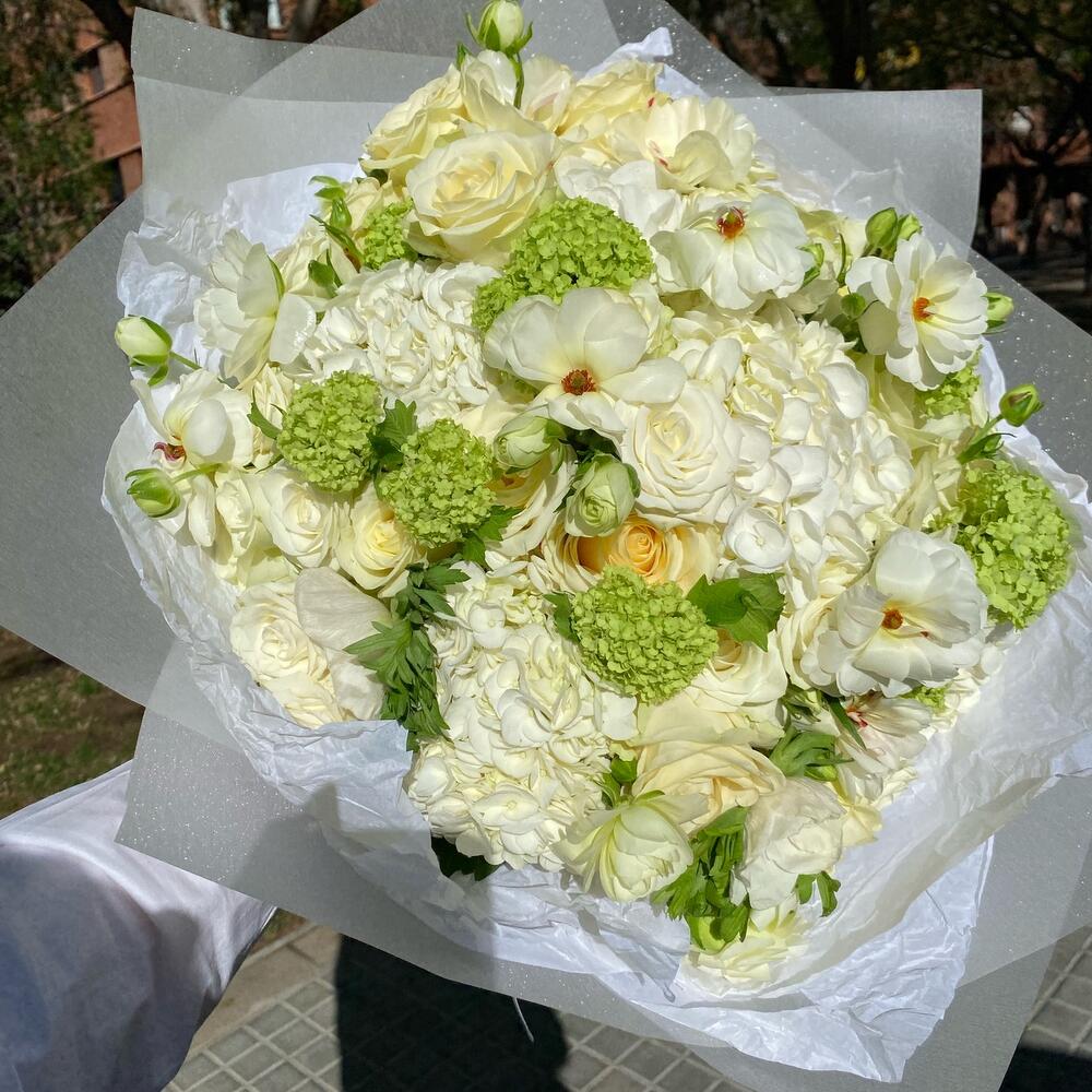 Spray rose - 10 ud. hortensia - 6 ud. rose white - 10 ud. packaging - 1 ud. vyburnum - 10 ud. lisianthus - 10 ud.