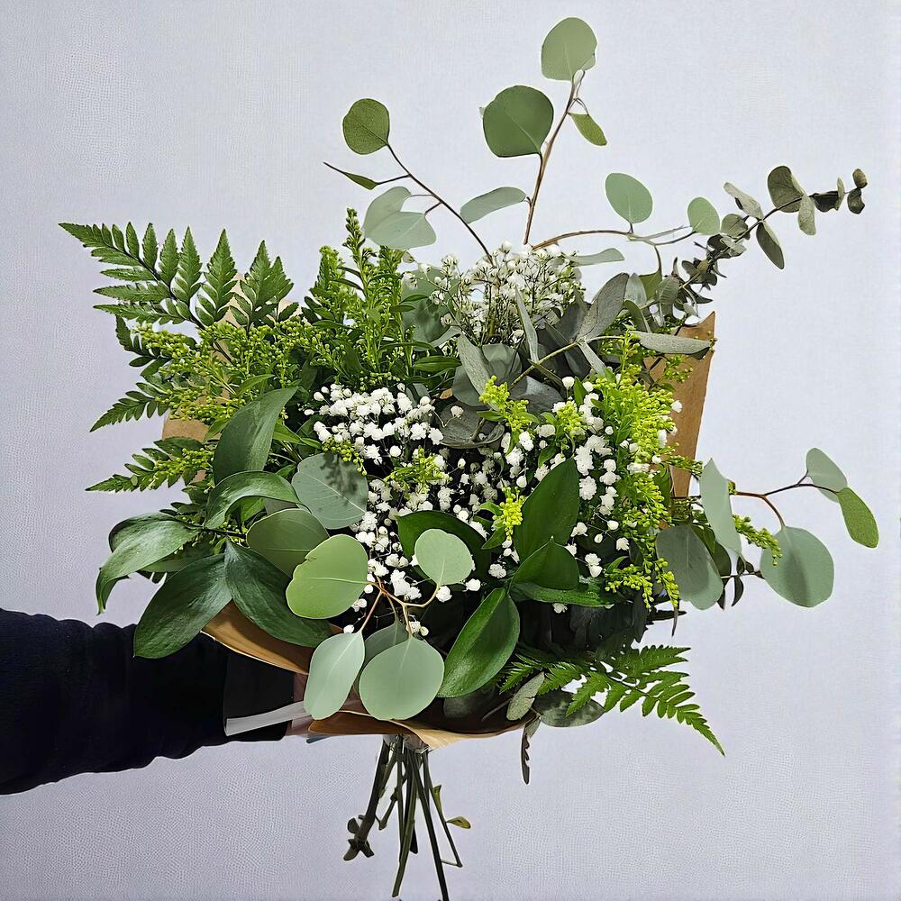 Este ramo es una celebración de la belleza natural con una combinación armoniosa de eucalipto, helechos y toques delicados de gypsophila. Perfecto para quienes buscan un detalle fresco y elegante, ideal para cualquier ocasión. Su diseño minimalista resalta la pureza de la naturaleza, aportando un aire sofisticado a cualquier espacio. Además, su durabilidad lo convierte en una opción práctica y decorativa. ¡Haz de este ramo un regalo inolvidable o el complemento perfecto para tu hogar!