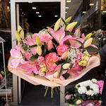 Ruscus - 5 ud. Lisianthus - 3 ud. Lilium - 3 ud. paniculata - 2 ud. peonia - 2 ud. rosa rosa - 2 ud.