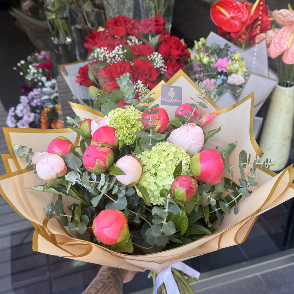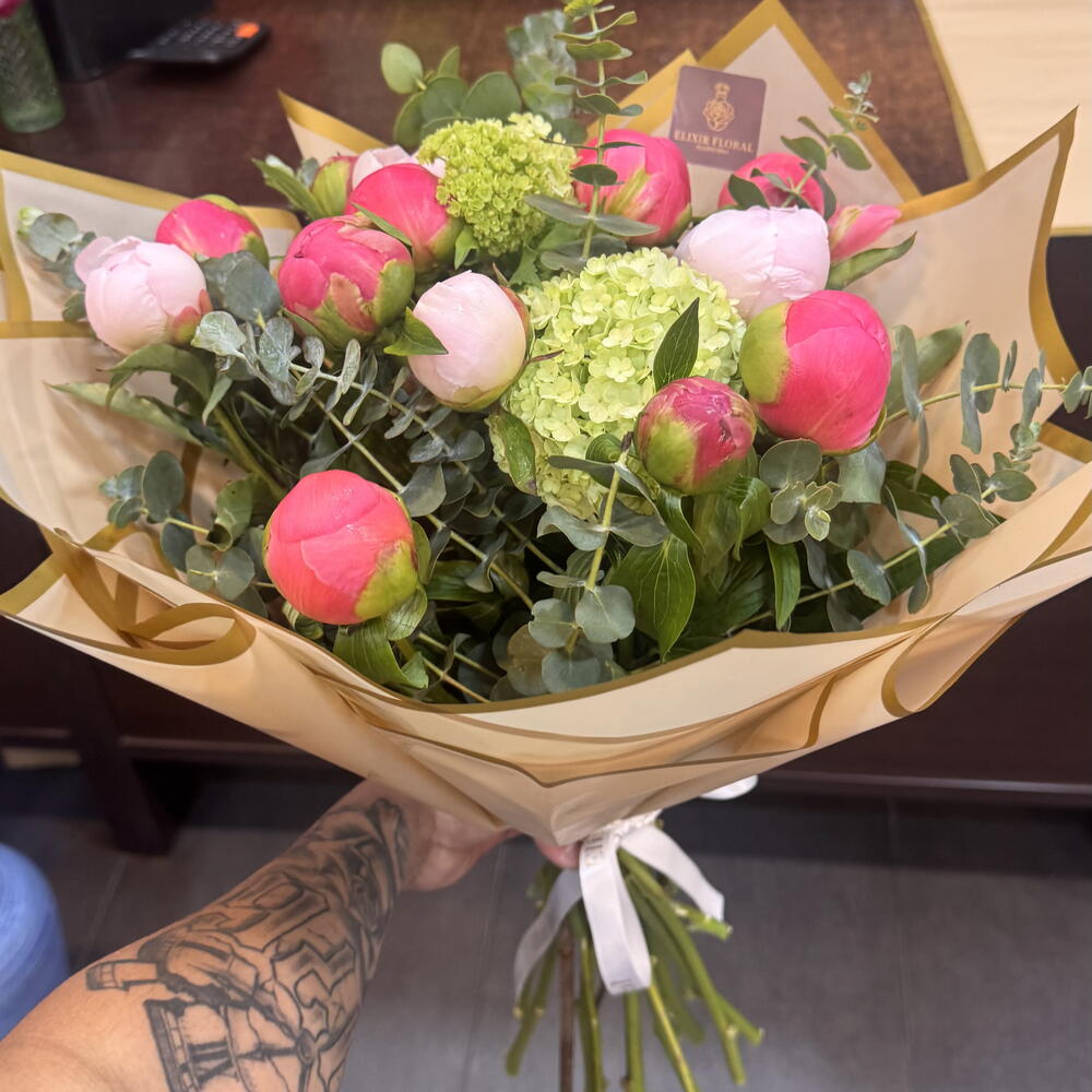 Ruscus - 3 ud. Viburnum - 1 ud. eucalipto - 3 ud. peonias rosa - 10 ud. Peonies blanca - 3 ud.