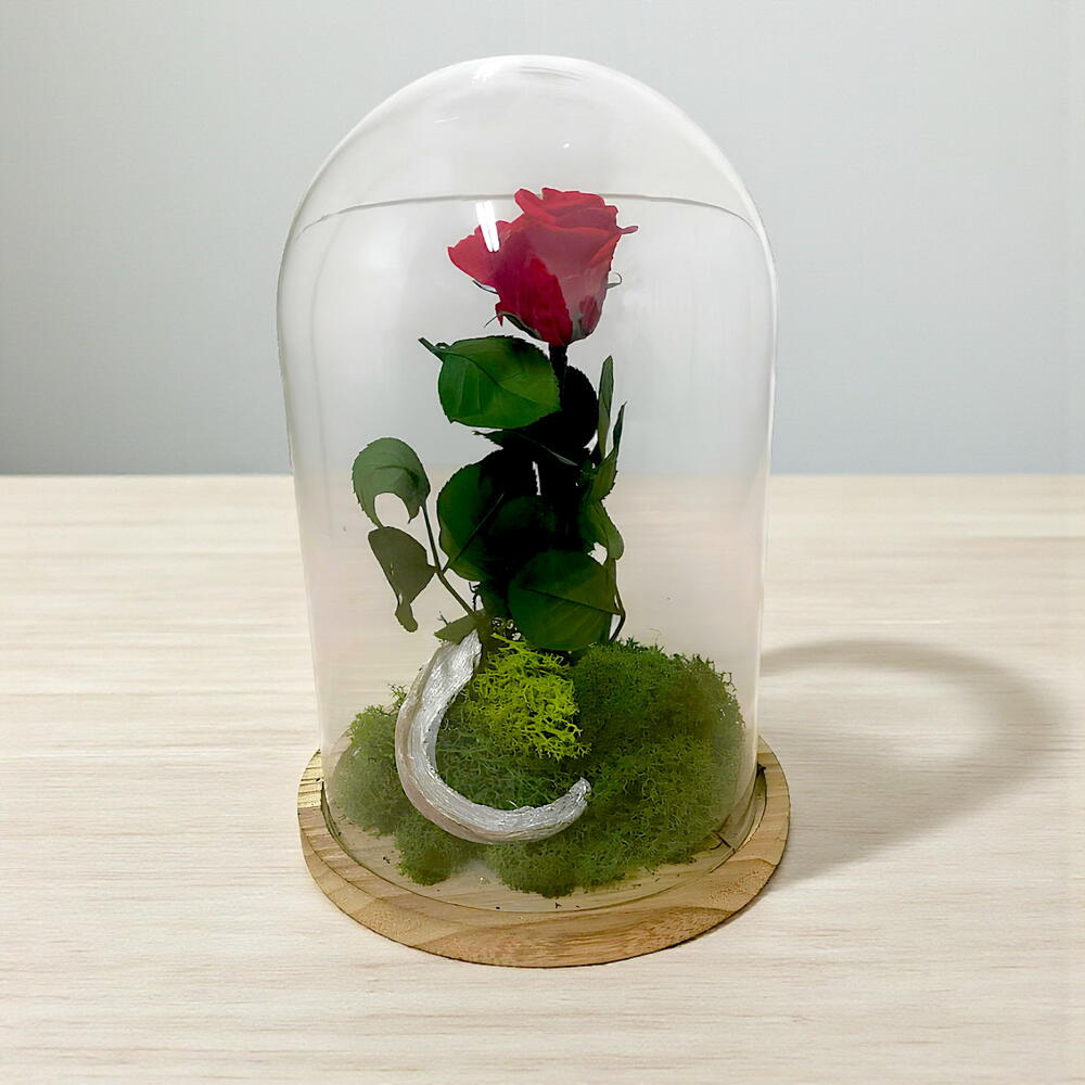 rosas rojas - 1 ud. musgo - 1 ud. cúpula de cristal - 1 ud. base de madera - 1 ud. decoración blanca - 1 ud.