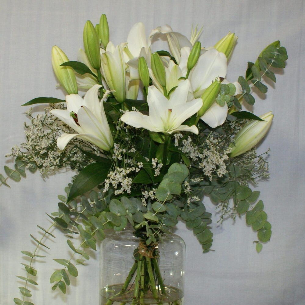 eucalipto cinerea - 3 ud. paniculata blanca - 2 ud. lirios blancos - 6 ud.