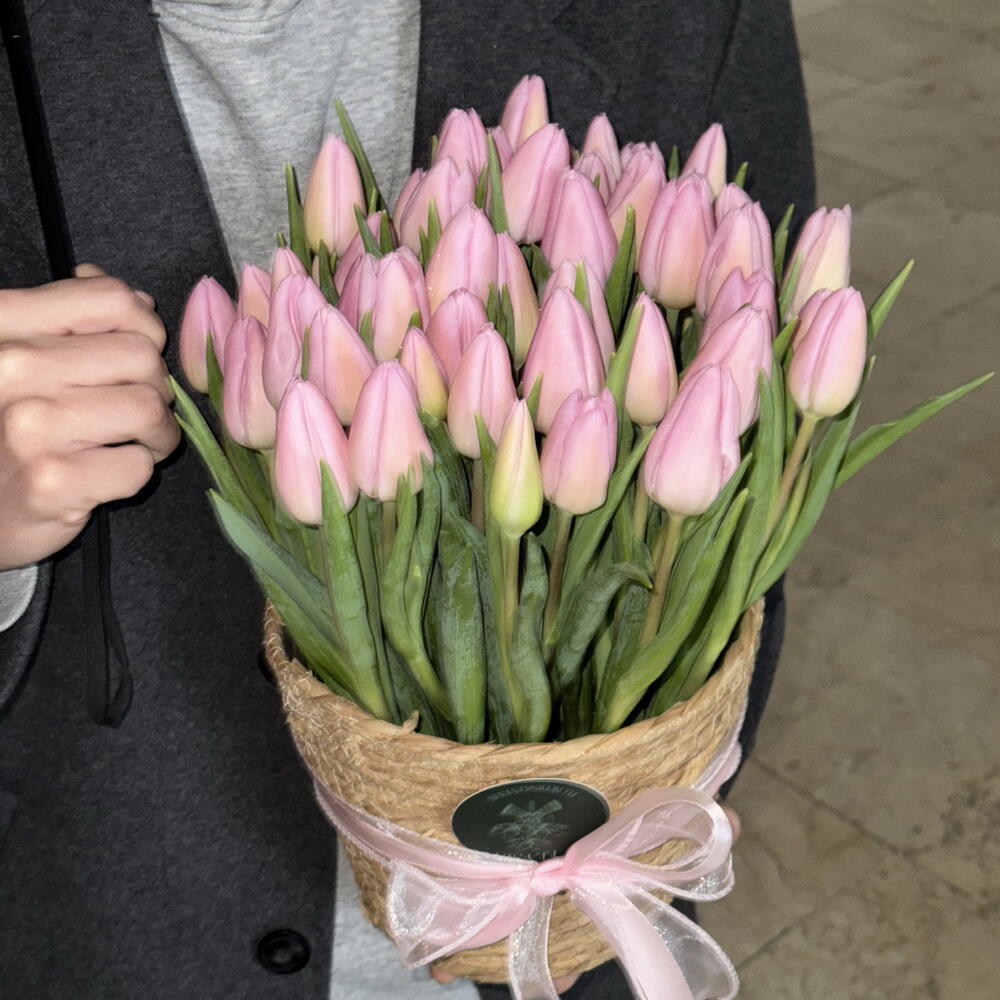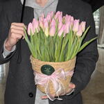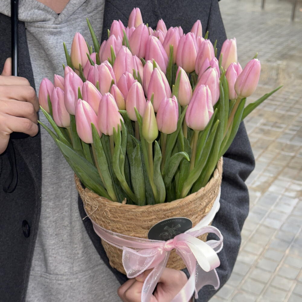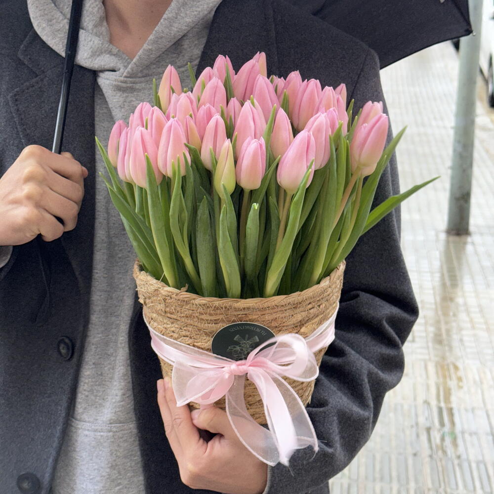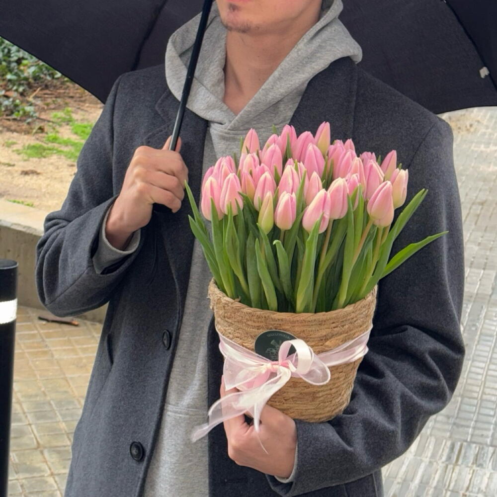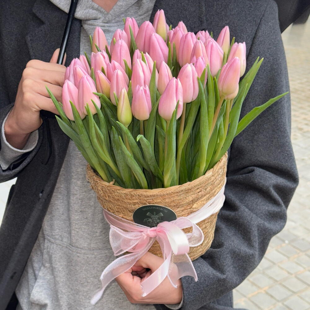 Basket - 1 ud. floral foam - 1 ud. ribbon satin - 2 ud. tulipanes rosas - 51 ud.