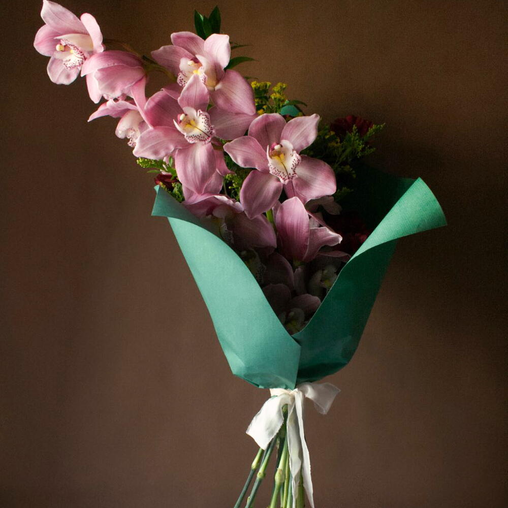 Este sofisticado ramo destaca por la elegancia de las orquídeas cymbidium en delicados tonos rosados, que le otorgan un aire de distinción y sutileza. Envueltas en un papel verde oscuro que resalta su color y belleza, estas flores son ideales para ocasiones especiales donde se quiera expresar aprecio y elegancia. Perfecto para quienes buscan un detalle único y refinado que llene de estilo cualquier espacio.