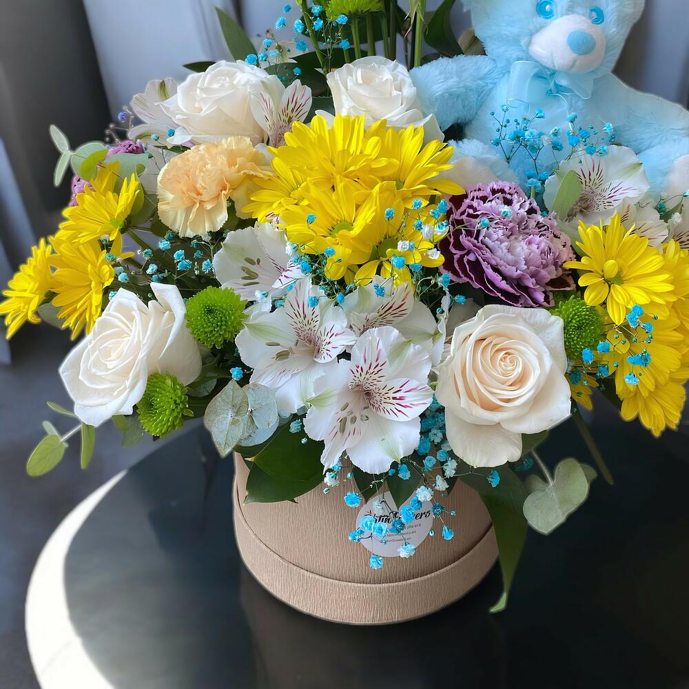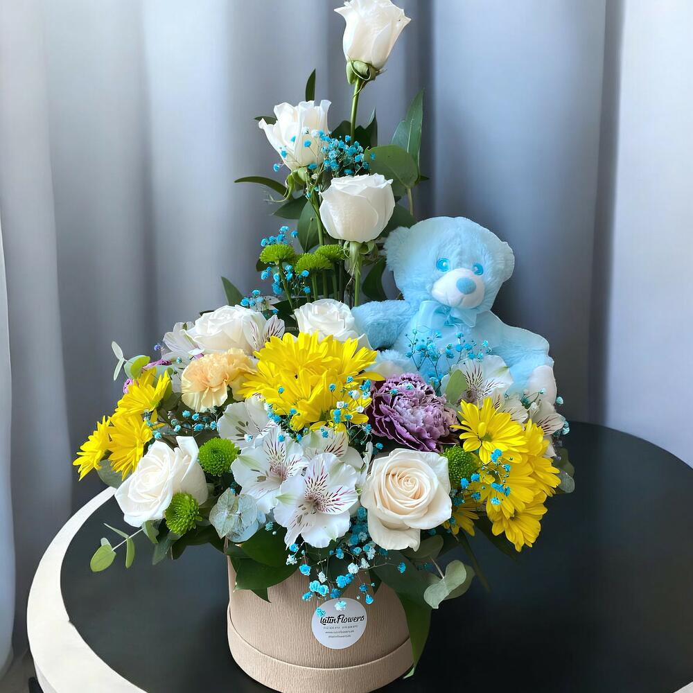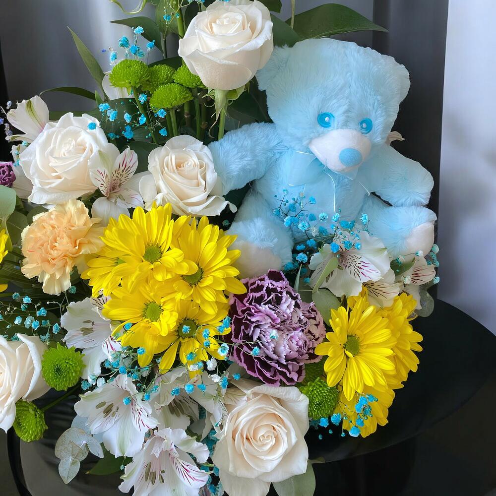 Este encantador arreglo floral es un tributo perfecto para celebrar la llegada de un nuevo miembro a la familia. Con un tierno osito de peluche azul y flores en tonos frescos y alegres, simboliza pureza, amor y los nuevos comienzos. Ideal para dar la bienvenida a un bebé recién nacido y felicitar a los orgullosos padres.