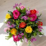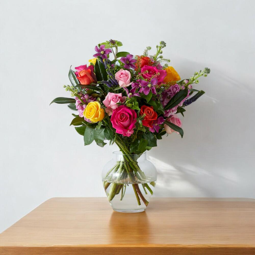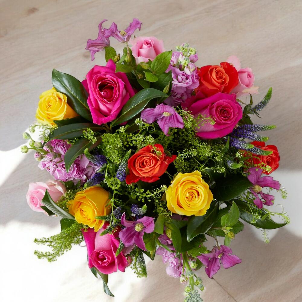 Bouquet de Rosas Multicolor con Clematis y Verónicas Este vibrante bouquet presenta una colorida combinación de rosas en tonos fucsia, rosita, naranja y amarillo, acompañadas por la delicadeza de los clematis, alhelíes y verónicas. Los verdes frescos completan el diseño, aportando un toque natural y armonioso. Este ramo es perfecto para ocasiones alegres y festivas, o simplemente para llenar cualquier espacio con energía y vitalidad. Para mantener la frescura de este bouquet, recorta los tallos en diagonal antes de colocarlos en un jarrón con agua limpia. Cambia el agua cada dos días y añade conservante floral, si está disponible. Colócalo en un lugar fresco, lejos de la luz solar directa y corrientes de aire, para disfrutar de su belleza durante más tiempo.