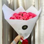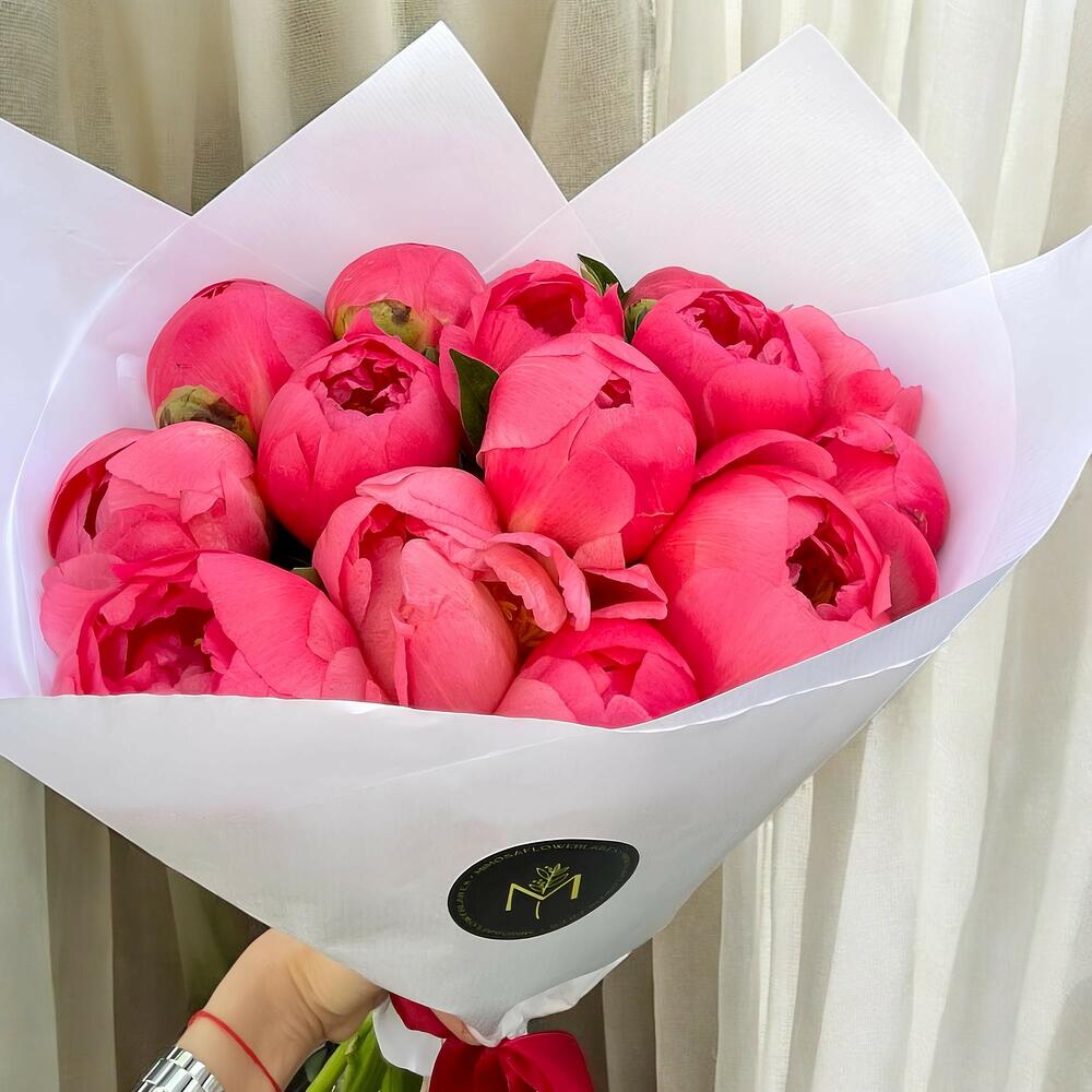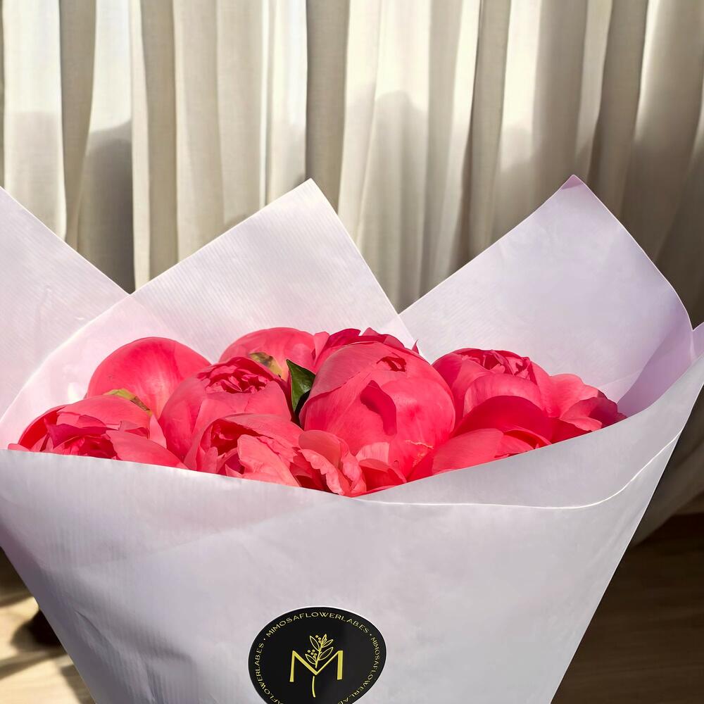 Un ramo deslumbrante compuesto por peonías en un vibrante tono coral. Perfecto para transmitir calidez, alegría y elegancia en cualquier ocasión especial. Su presentación minimalista realza la belleza natural de las flores.